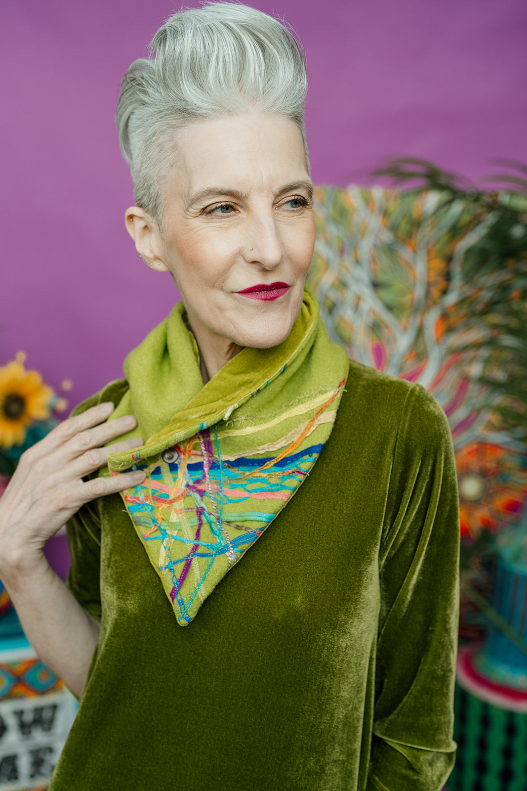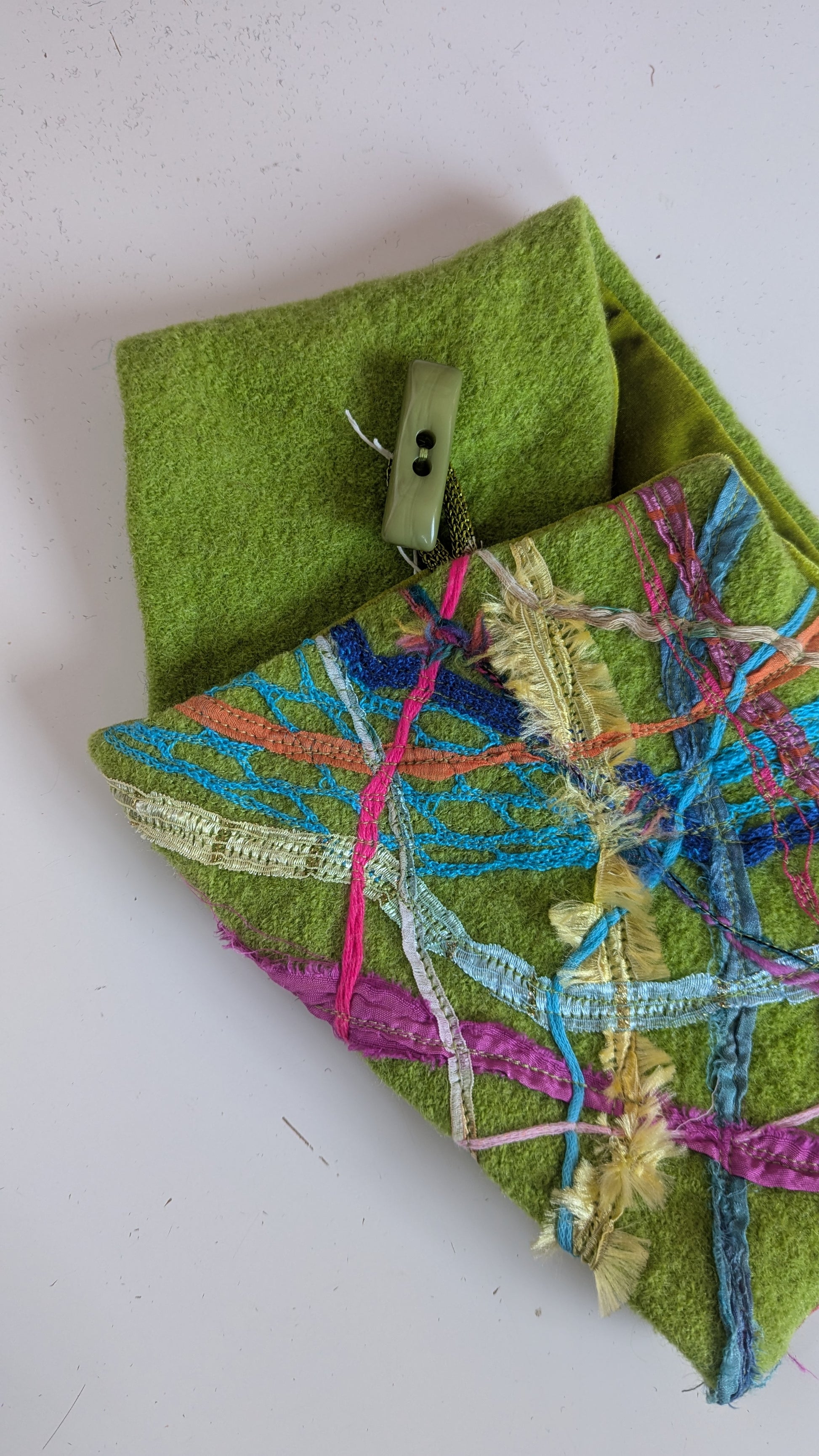 Lime green neck wrap in boiled wool with velvet lining and snap closure. Features handmade embellishments using machine embroidery and mixed materials. Each neck wrap is unique and may vary slightly from that pictured.