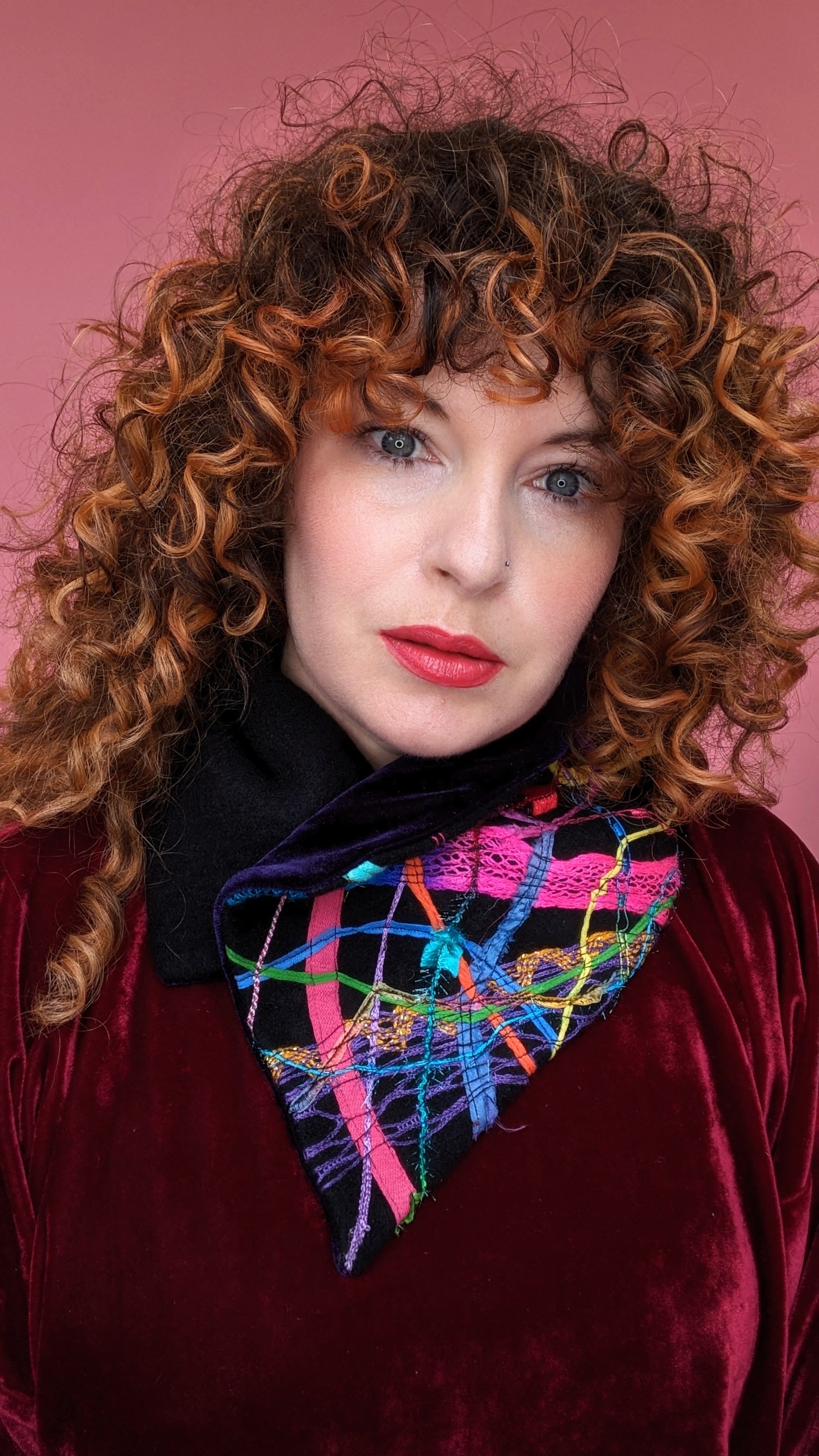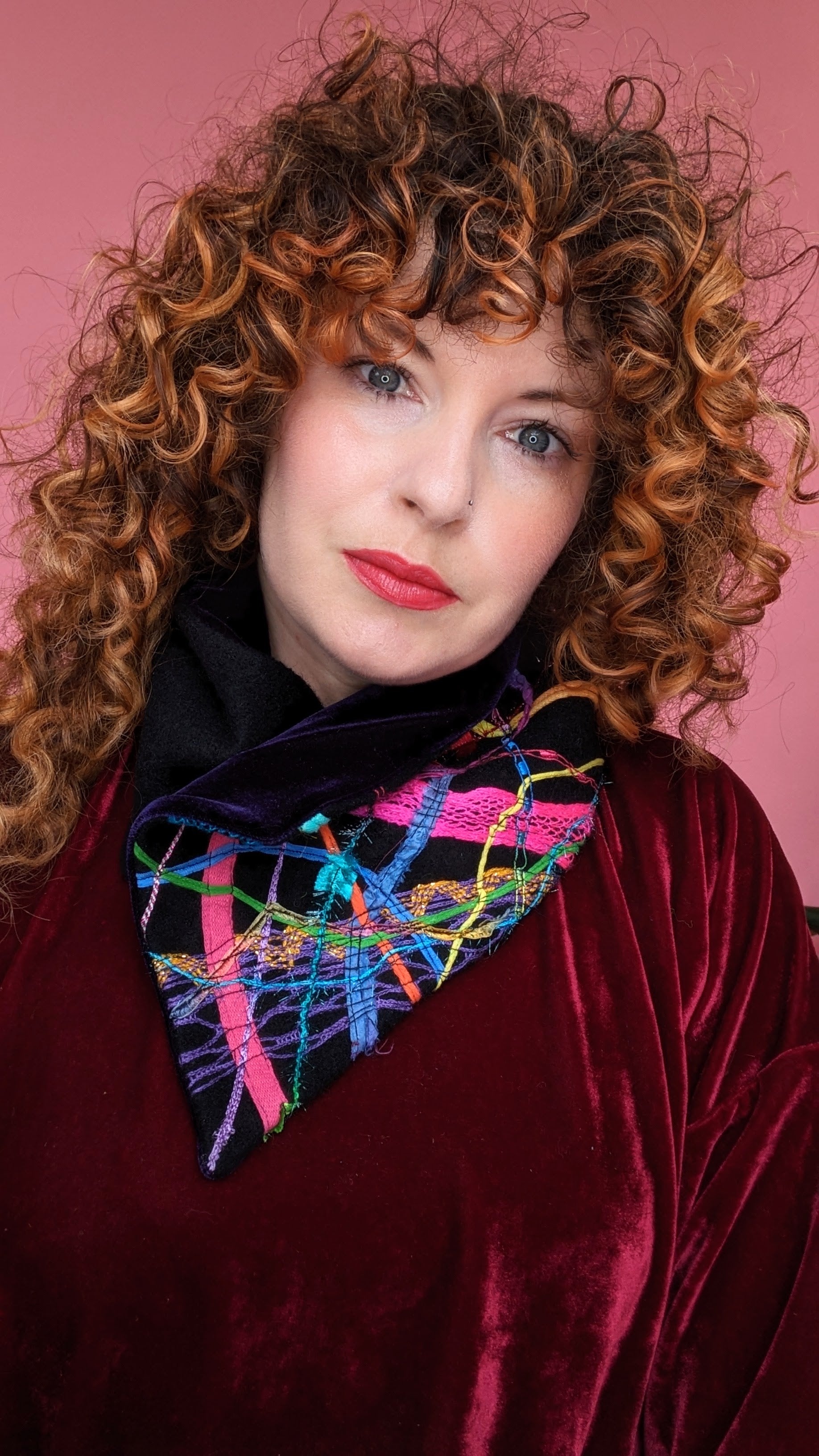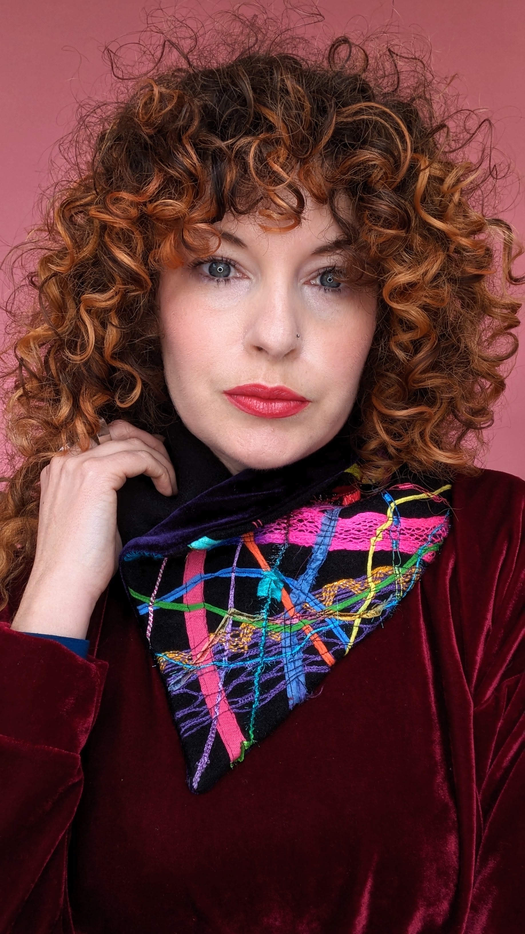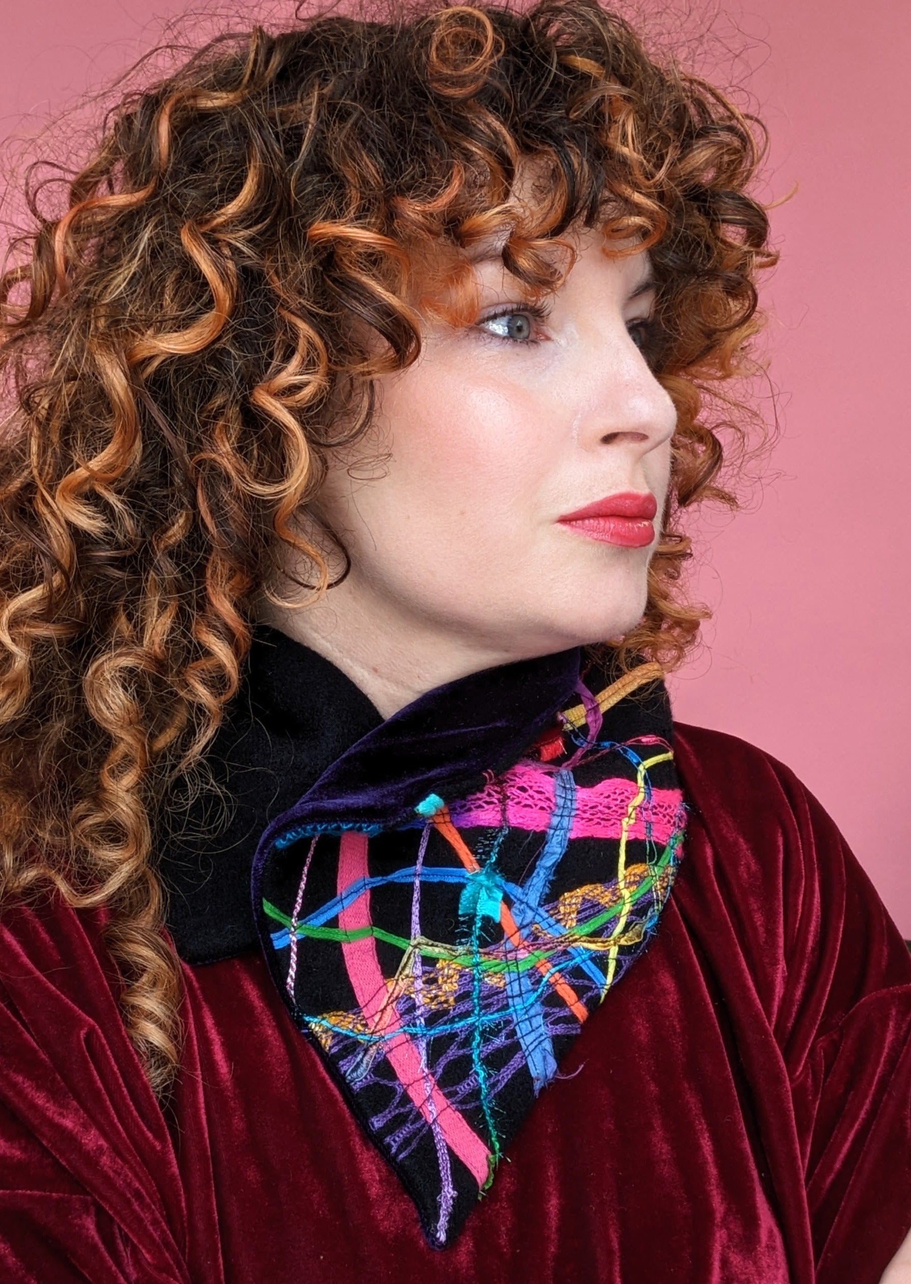Black green neck wrap in boiled wool with velvet lining and snap closure. Features handmade embellishments using machine embroidery and mixed materials. Each neck wrap is unique and may vary slightly from that pictured.