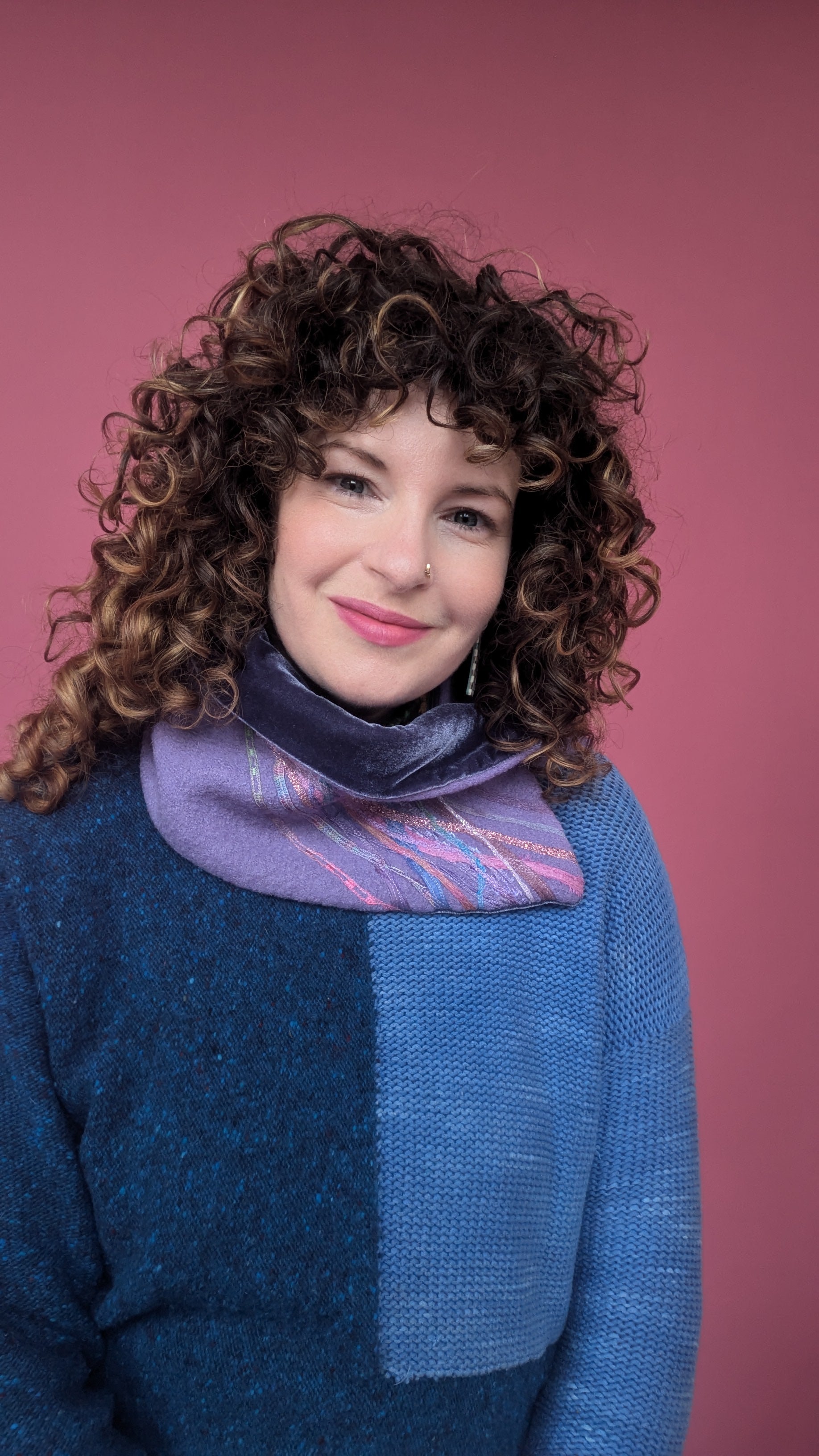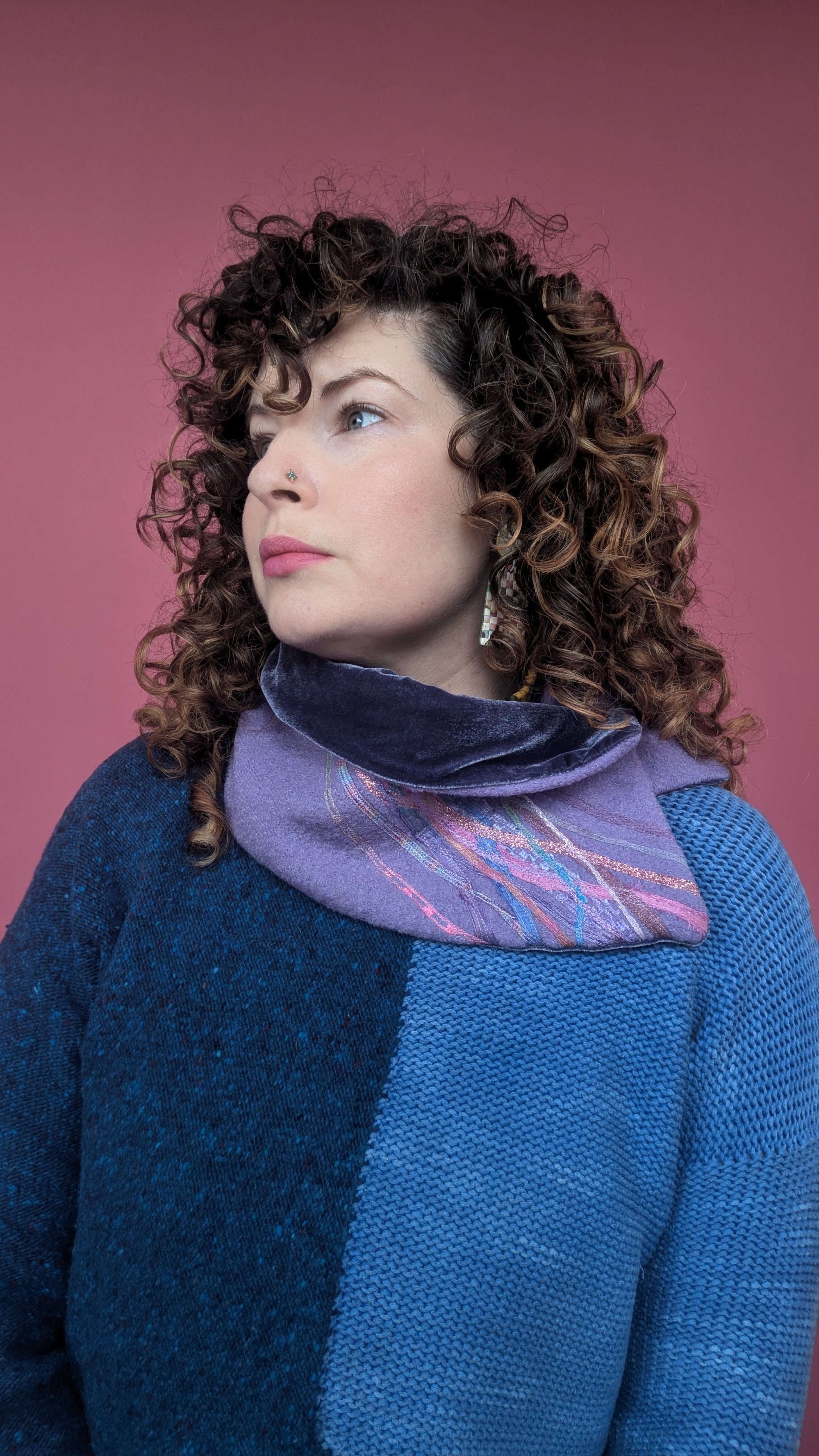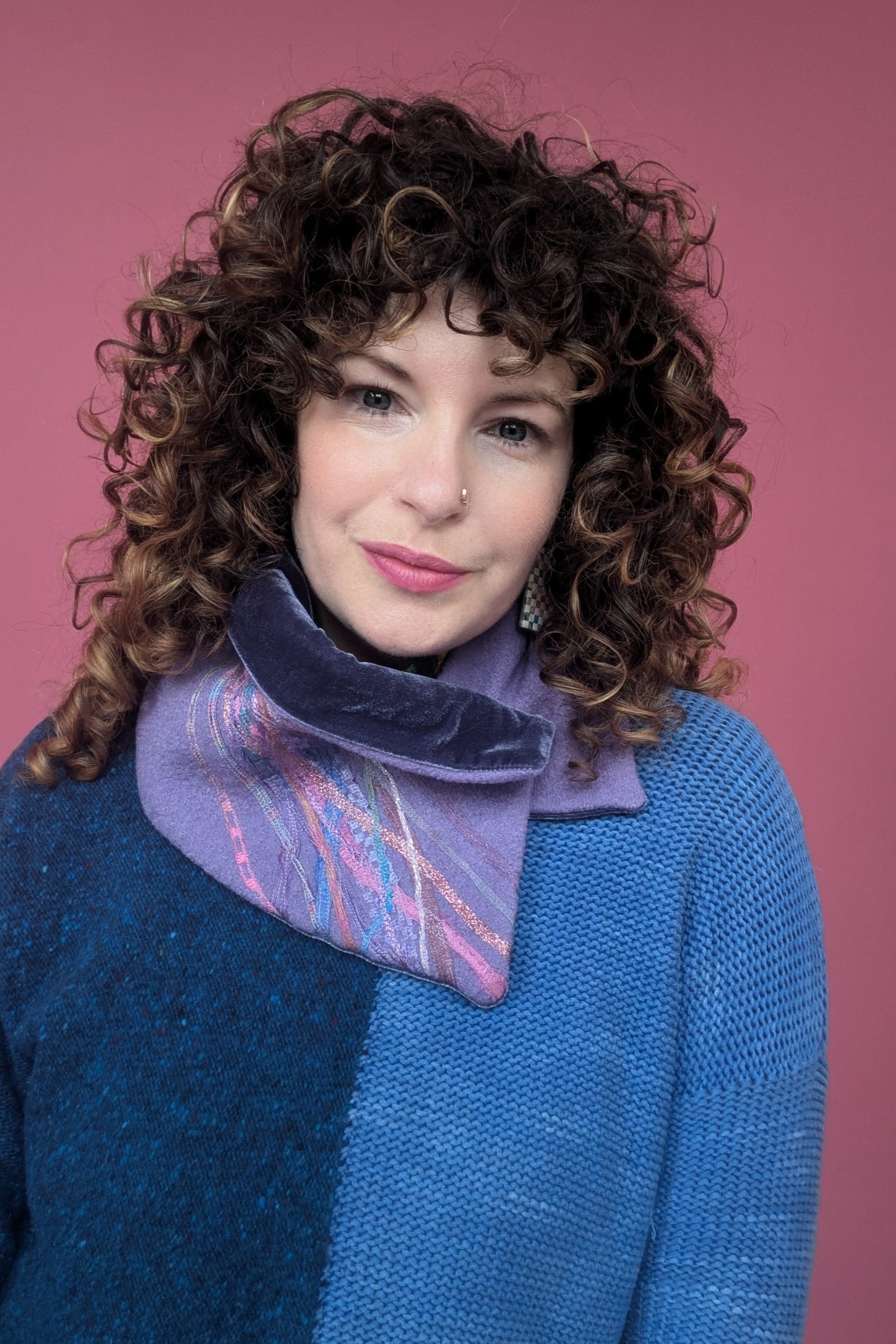 Stunning neck wrap in Lilac boiled wool with velvet lining and snap closure. Features handmade embellishments using machine embroidery and mixed materials. Each neck wrap is unique and may vary slightly from that pictured.