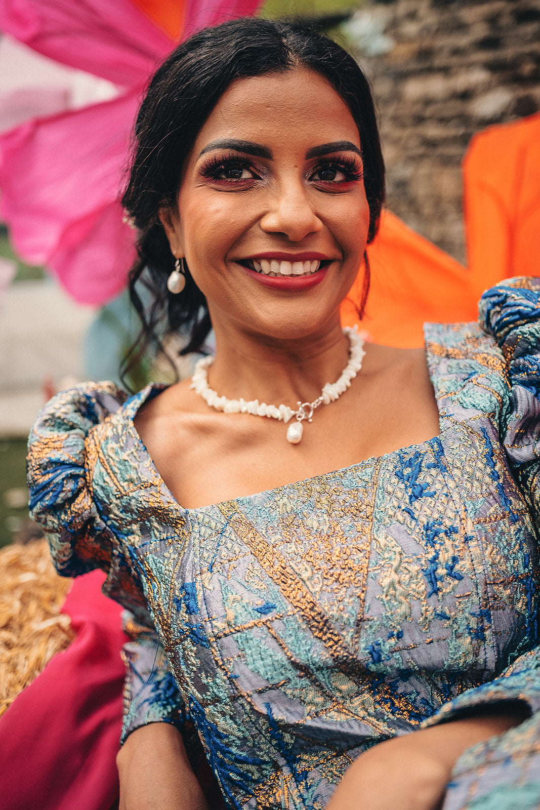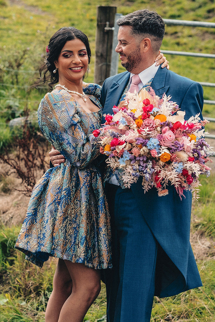 Amazing lined dress in our super luxe metallic fabric. This dress has metallic thread all the way through it making it extra shimmery and perfect for your big day!