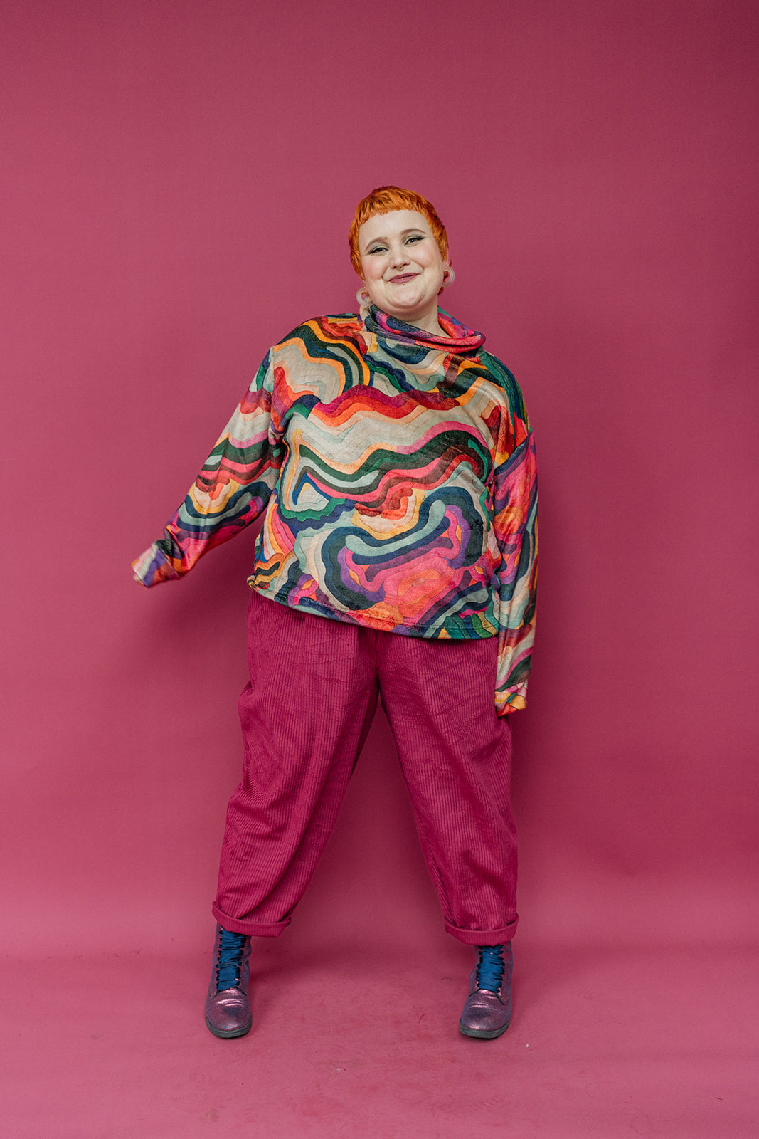Slouchy fit jumper with funnel neck and drop shoulders. Wear on its own or layered over a high neck for extra warmth in the chillier months! A beautiful all over rainbow tapestry print, this ones pretty special so won't be around for long!