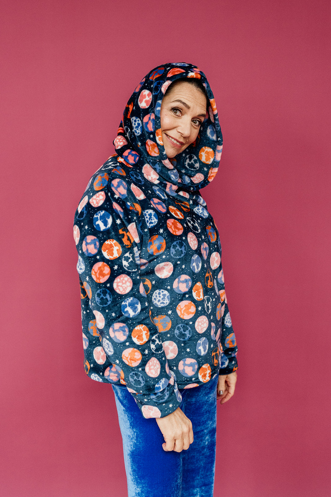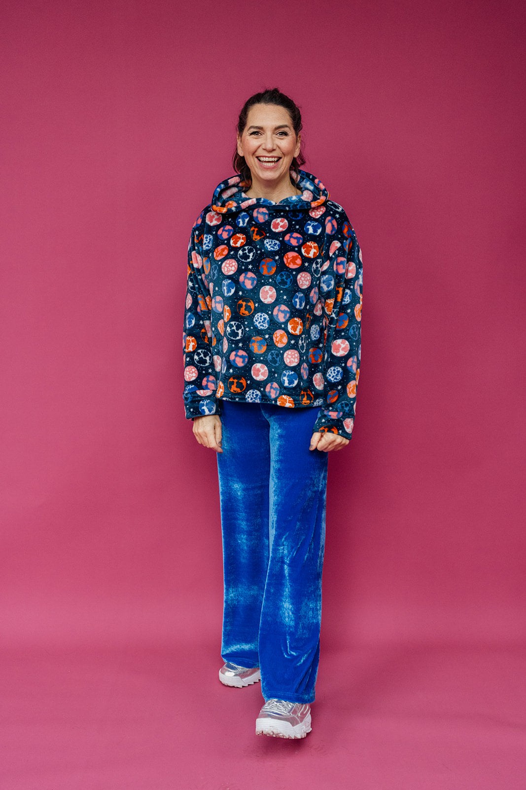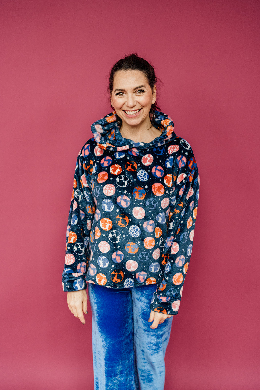 Slouchy fit jumper with funnel neck and drop shoulders. Wear on its own or layered over a high neck for extra warmth in the chillier months! The cutest print on the softest polar fleeces makes this an out of this world addition to any wardrobe!