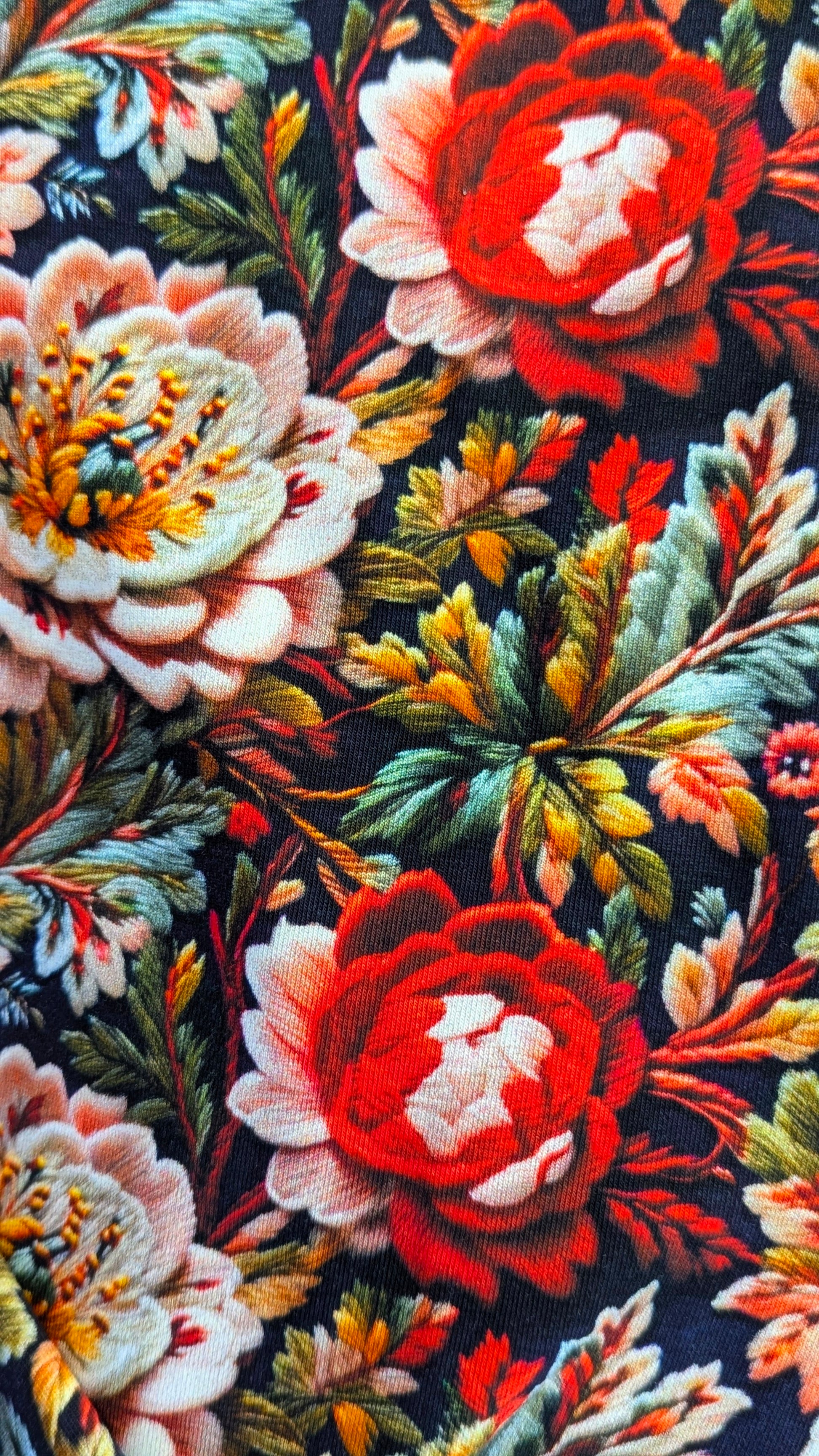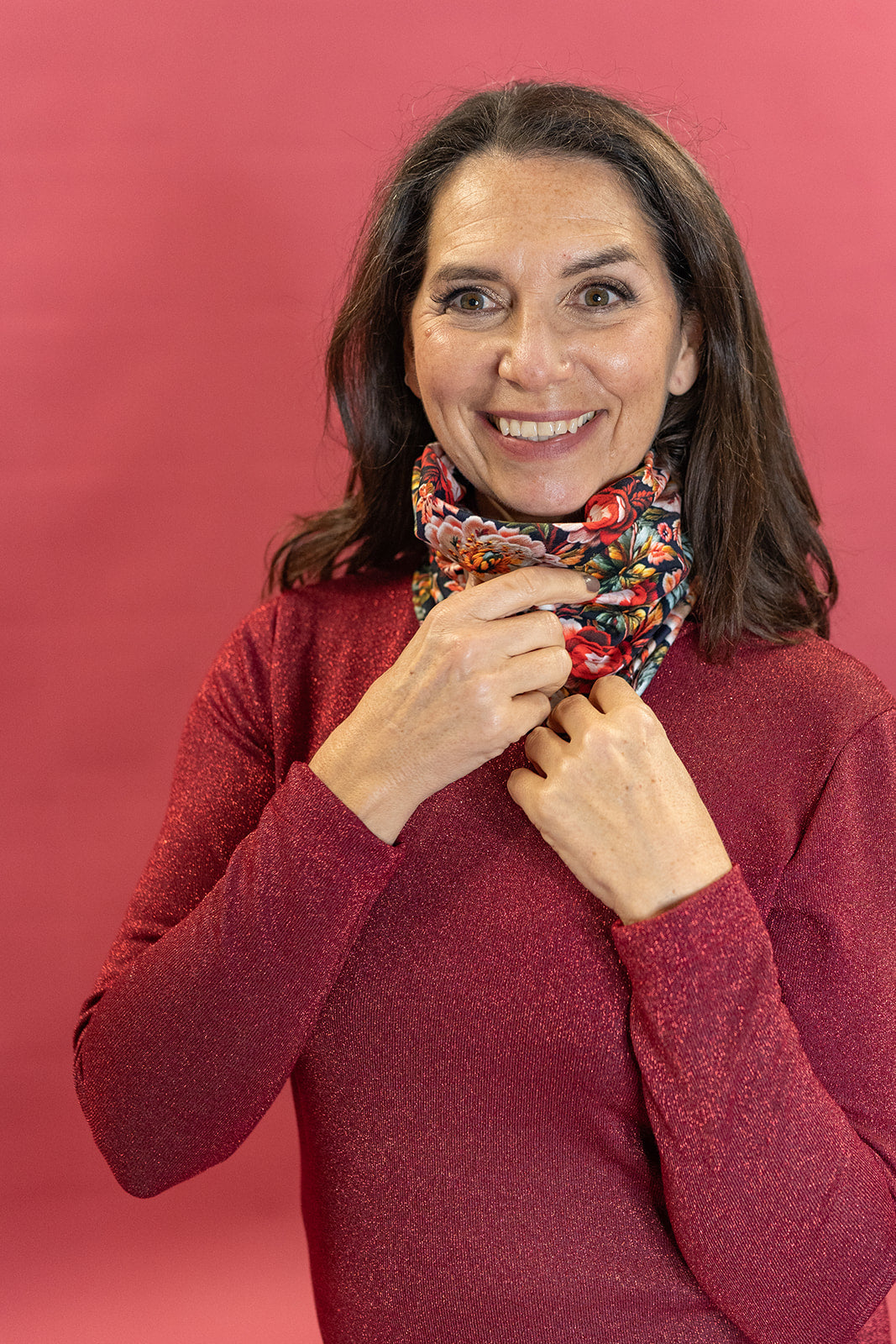 Snood in beautiful floral embroidery digital print soft jersey. Fits over the head and drape beautifully around the neck. Can be worn as a hood, worn over the nose for a temporary face covering or as a cowl style scarf.