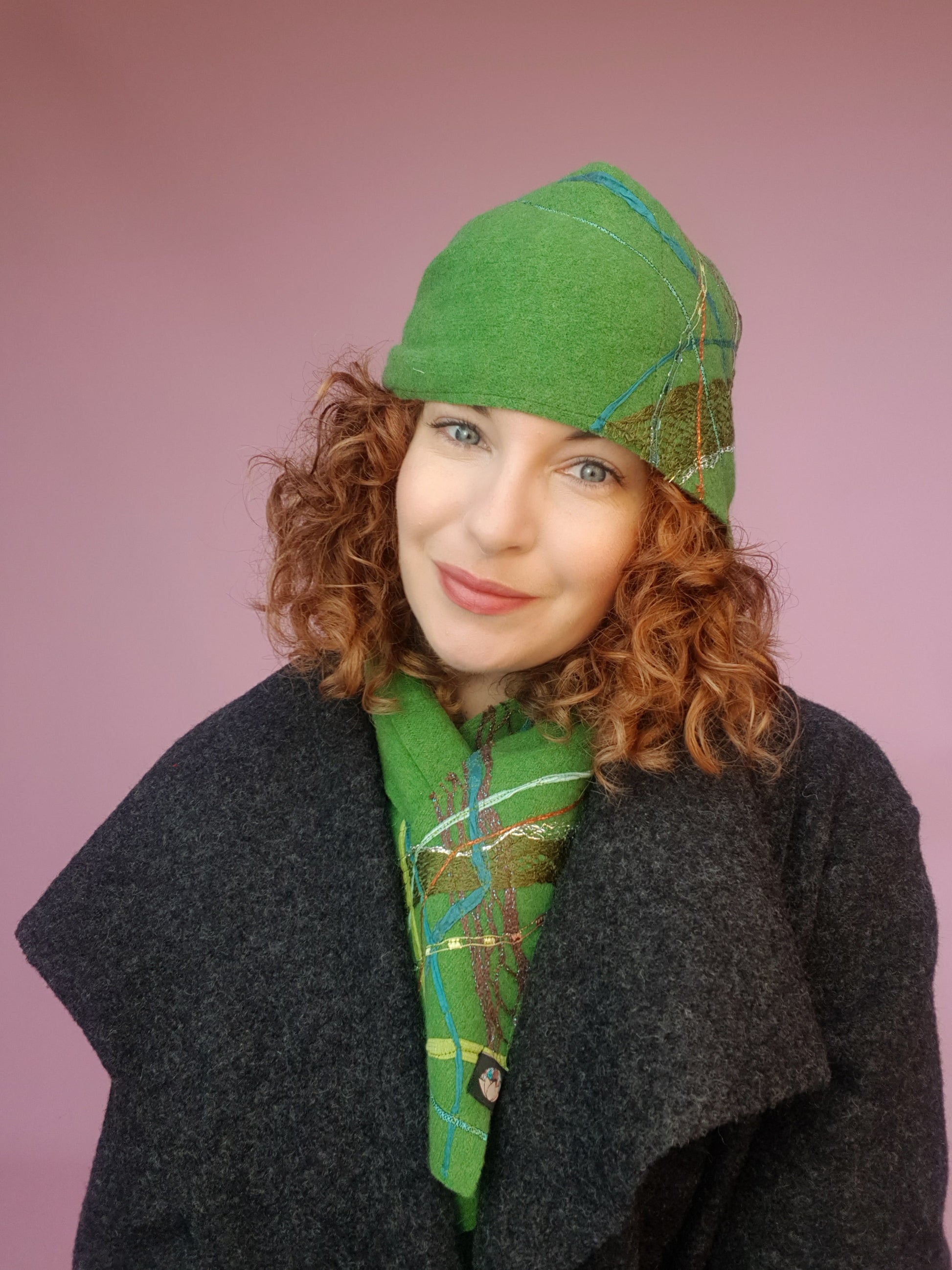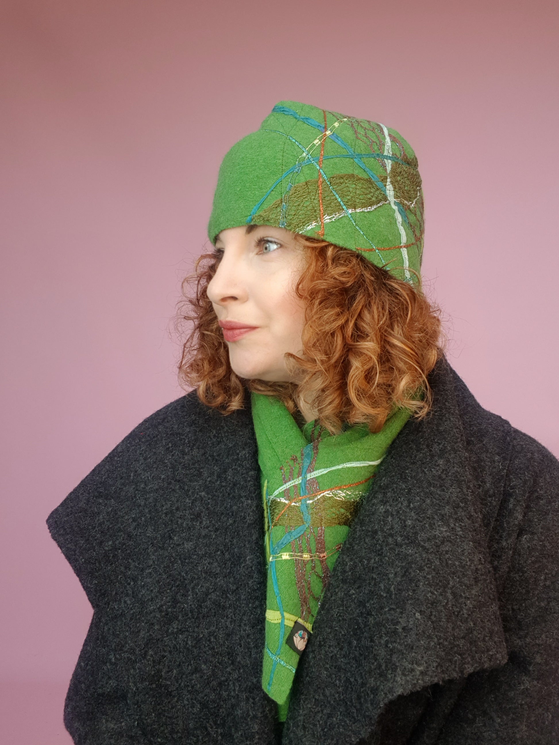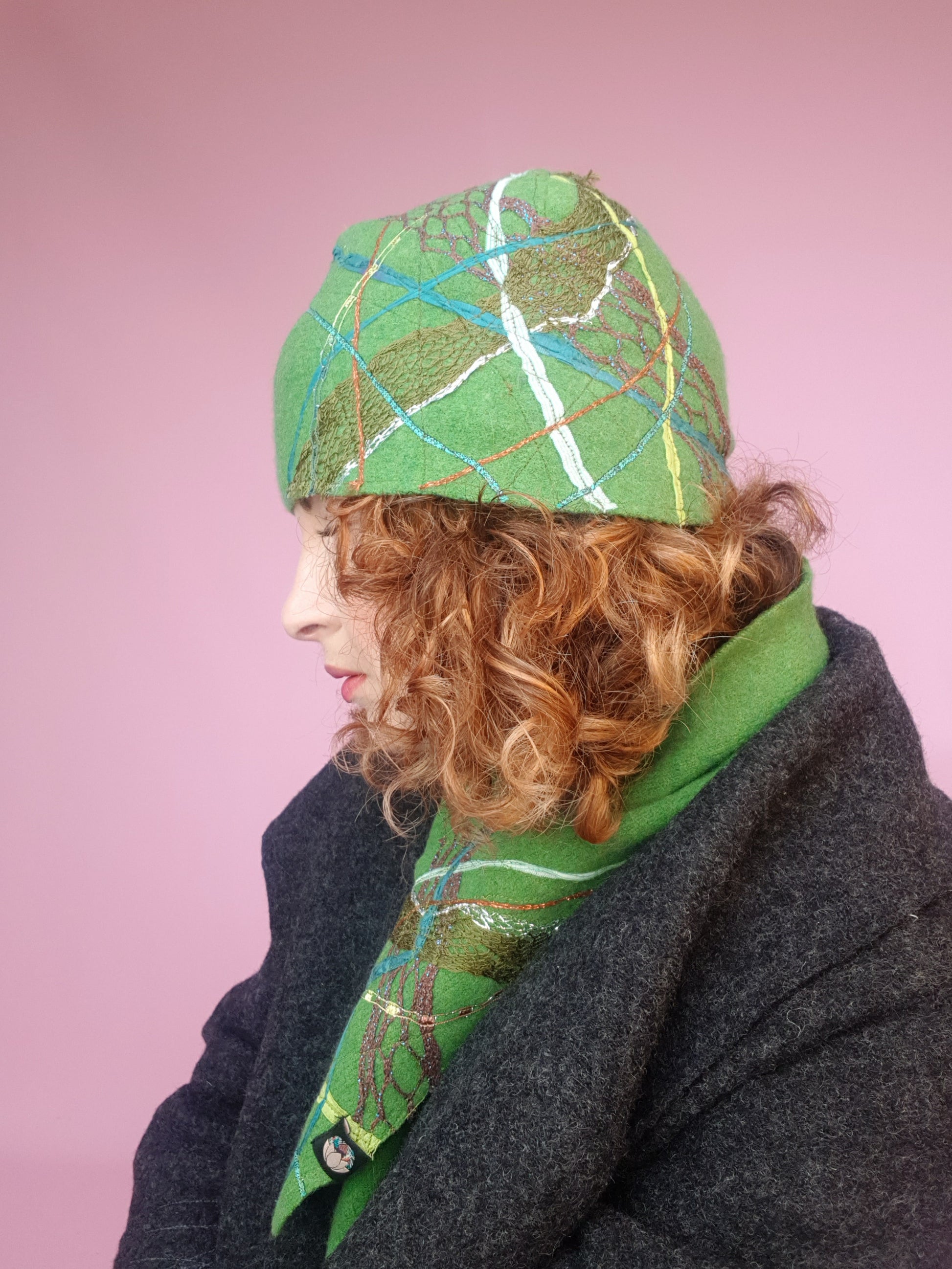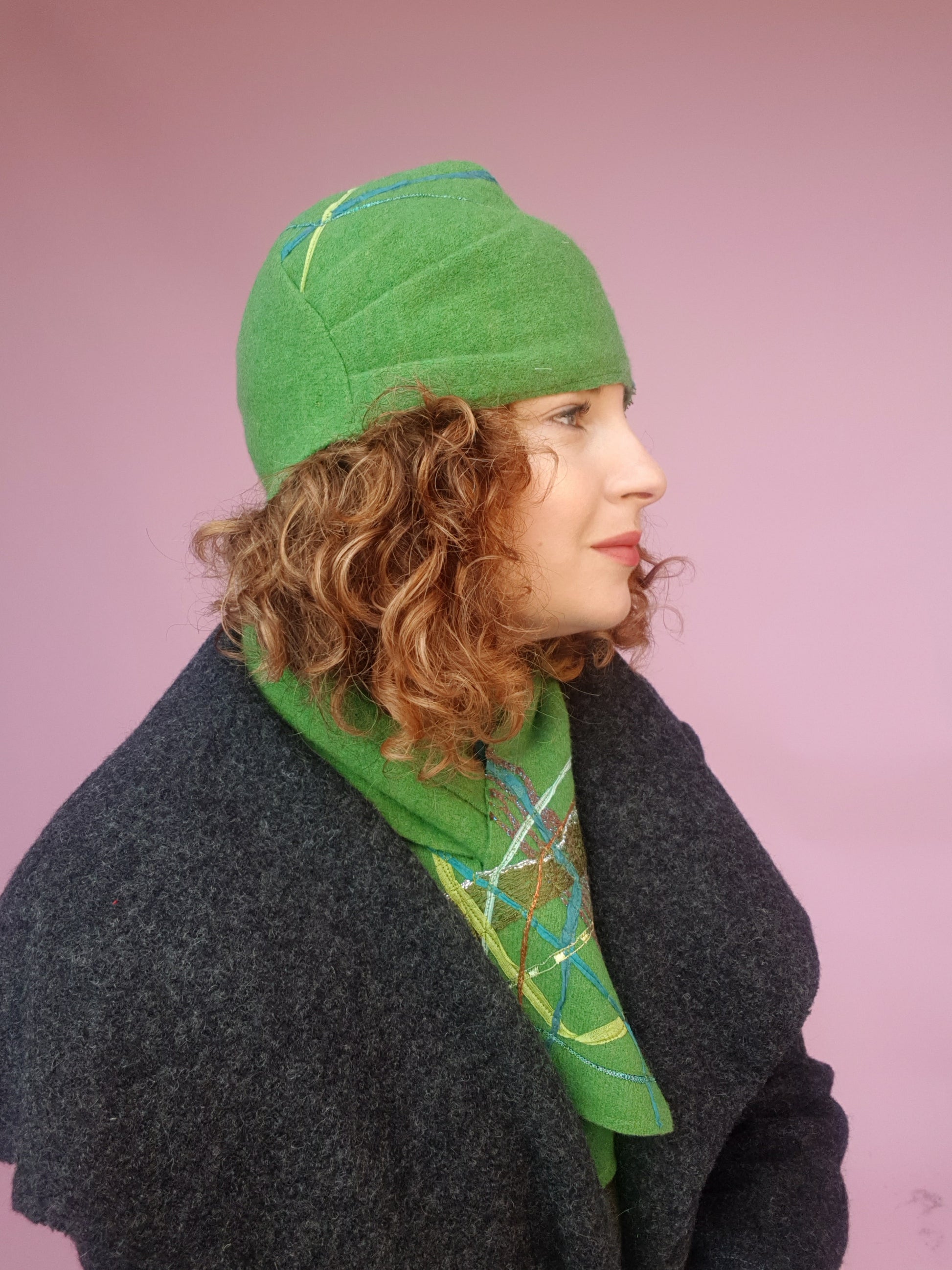 The 100% British lambs wool is knitted in house and lightly felted so it is warmer. It is then embellished with our unique embroidery technique for an artistic finish. Featuring side gathering for that 20’s vibe.