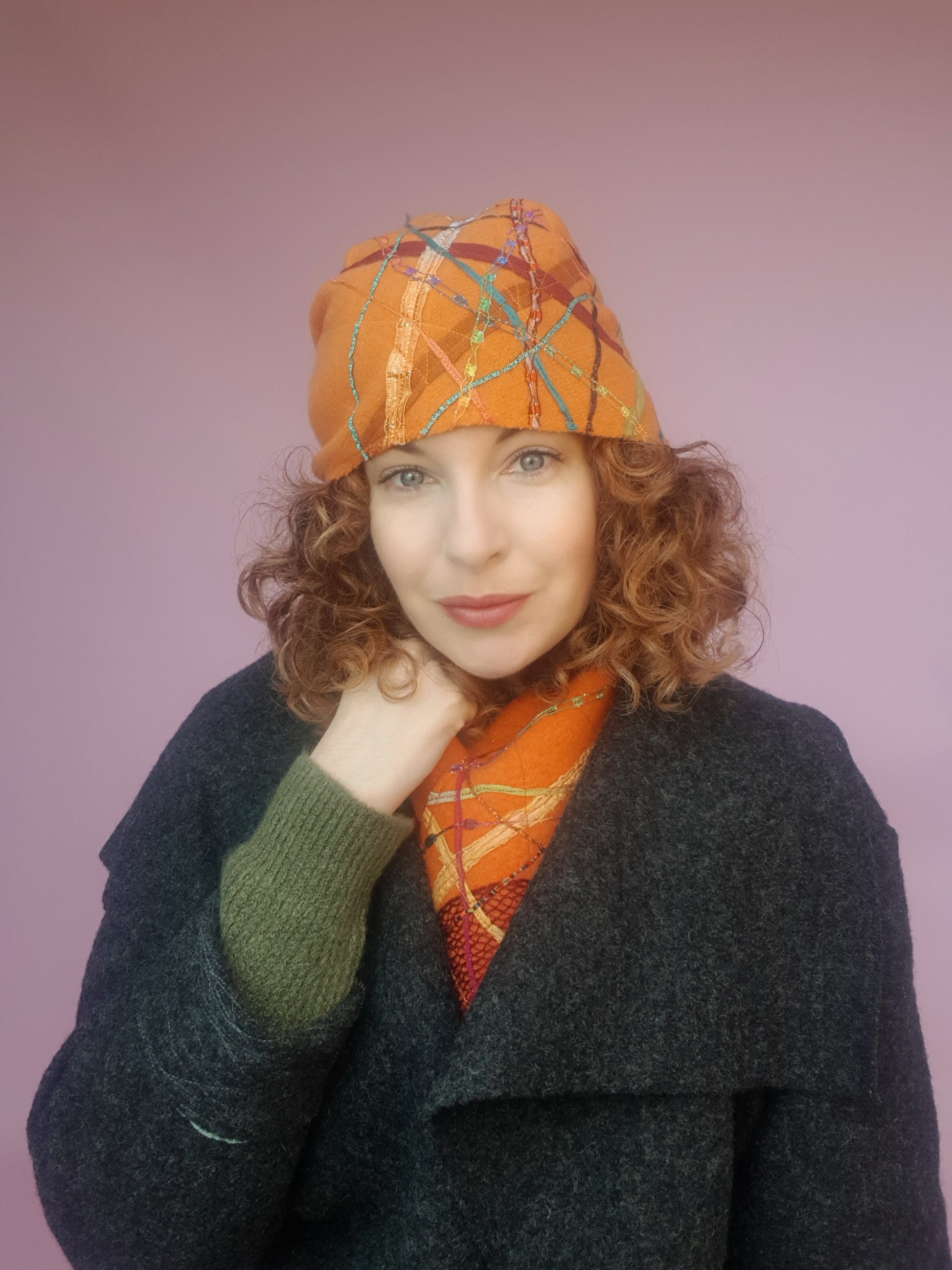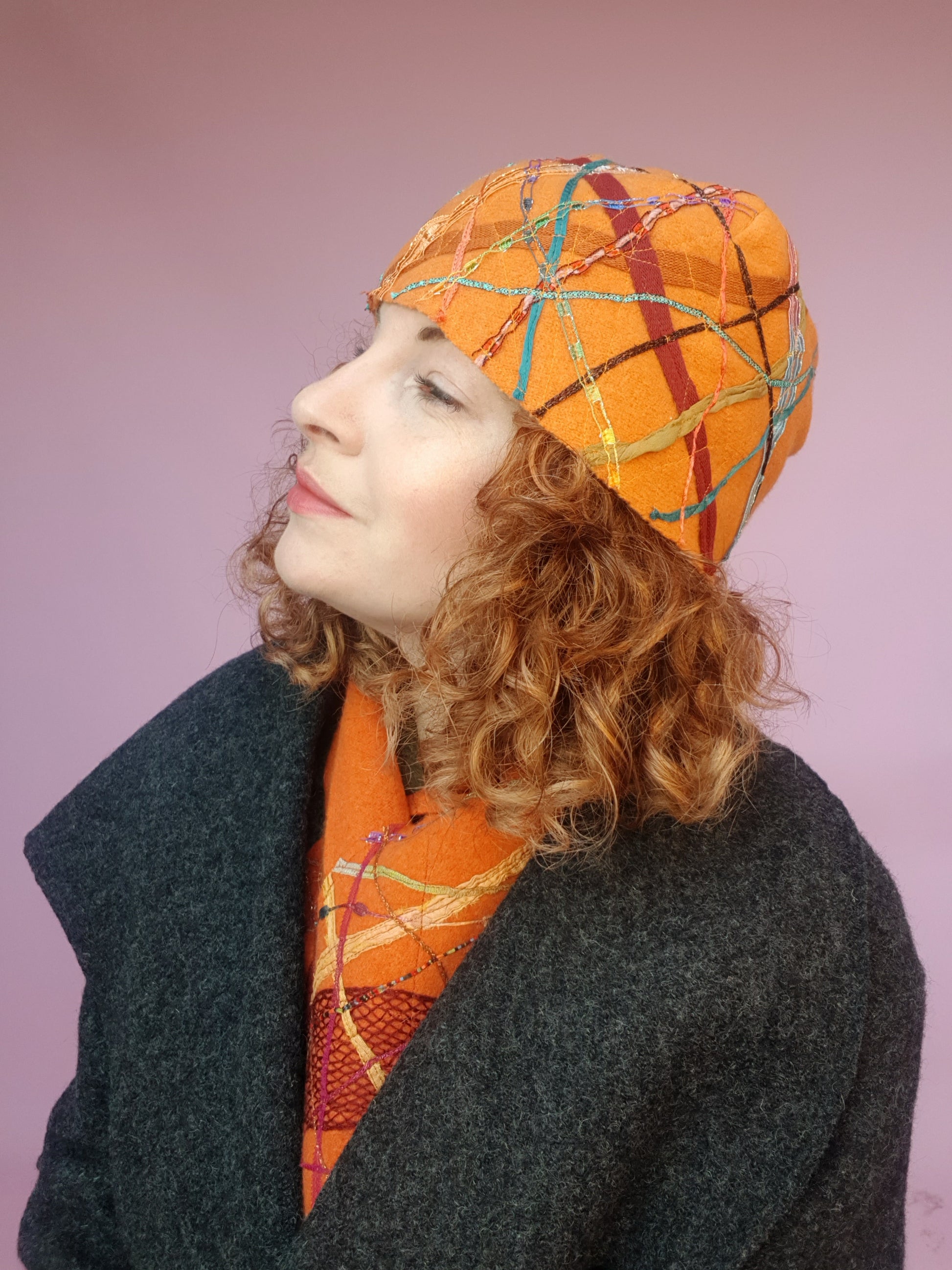 The 100% British lambs wool is knitted in house and lightly felted so it is warmer. It is then embellished with our unique embroidery technique for an artistic finish. Featuring side gathering for that 20’s vibe.