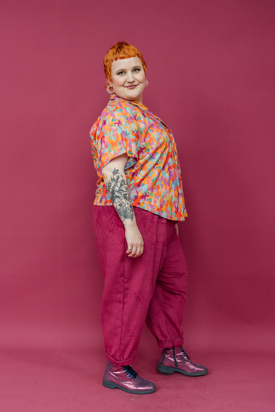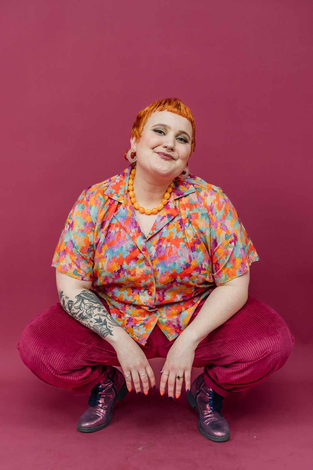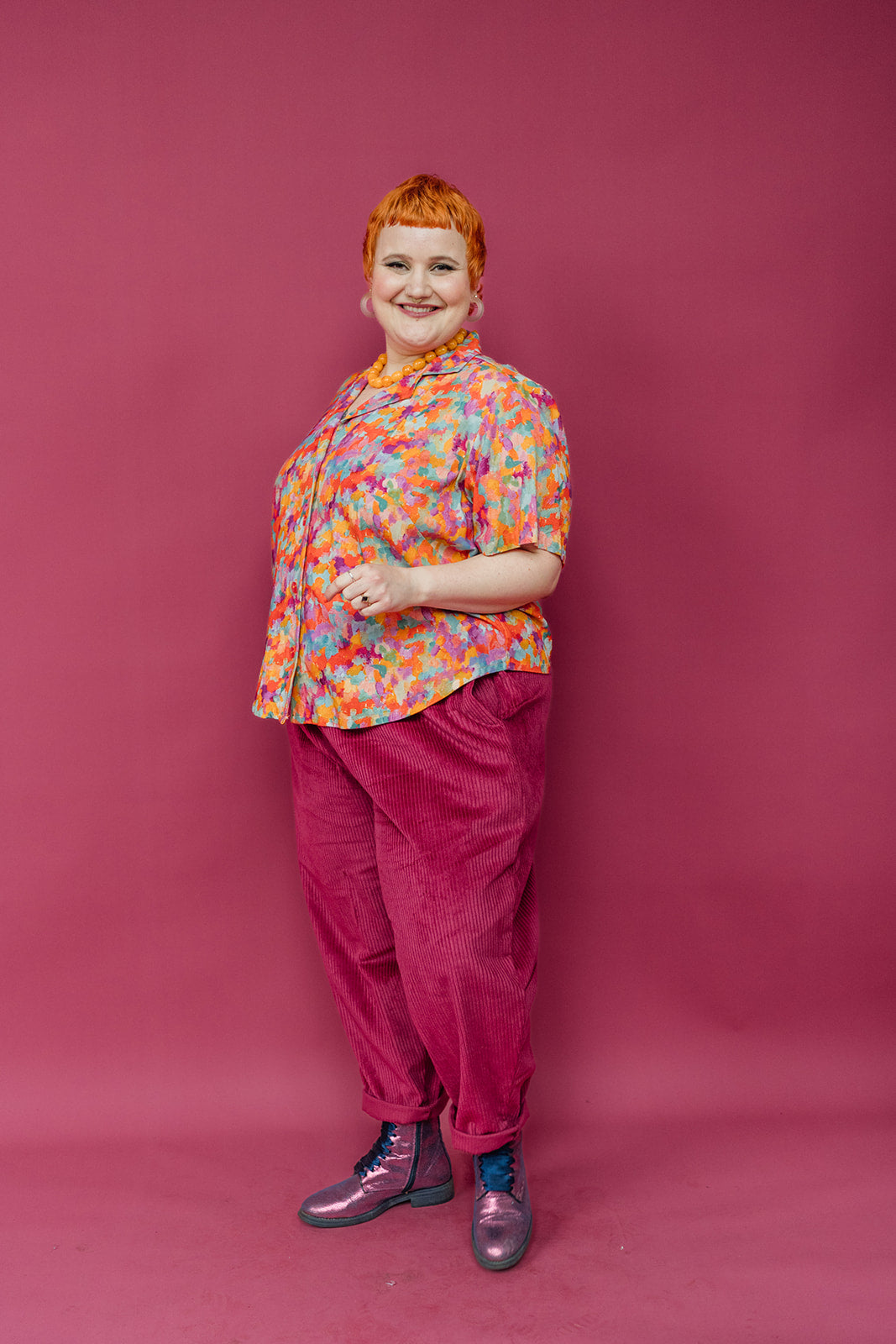 Handmade cropped bowling shirt in beautiful paint print, with a gorgeous mix of orange, pink and blue.