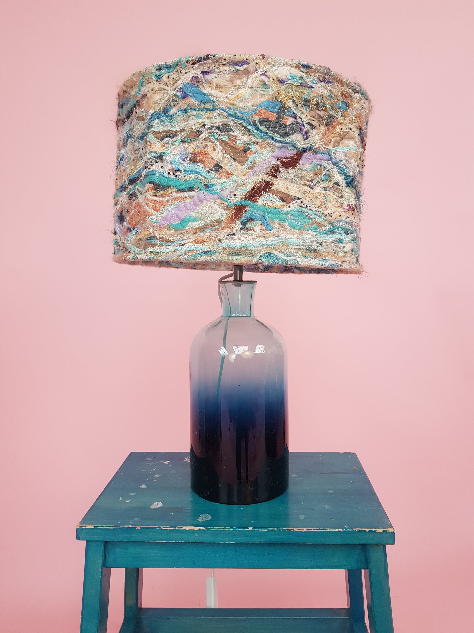 Lampshade covered in hand made material. Made using machine embroidery and mixed materials. Each lampshade is made individually and therefore completely unique. Colours may vary slightly from that pictured.