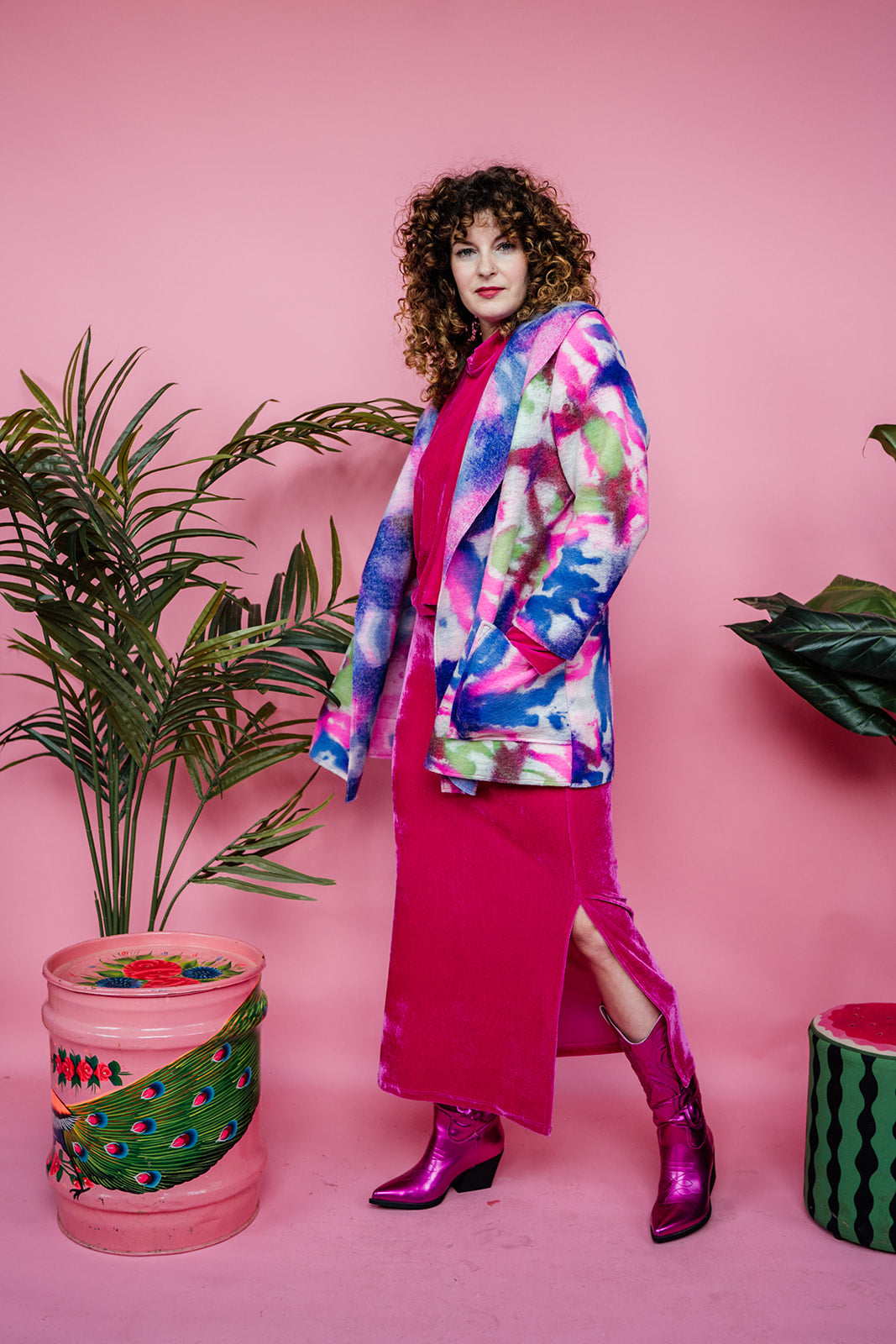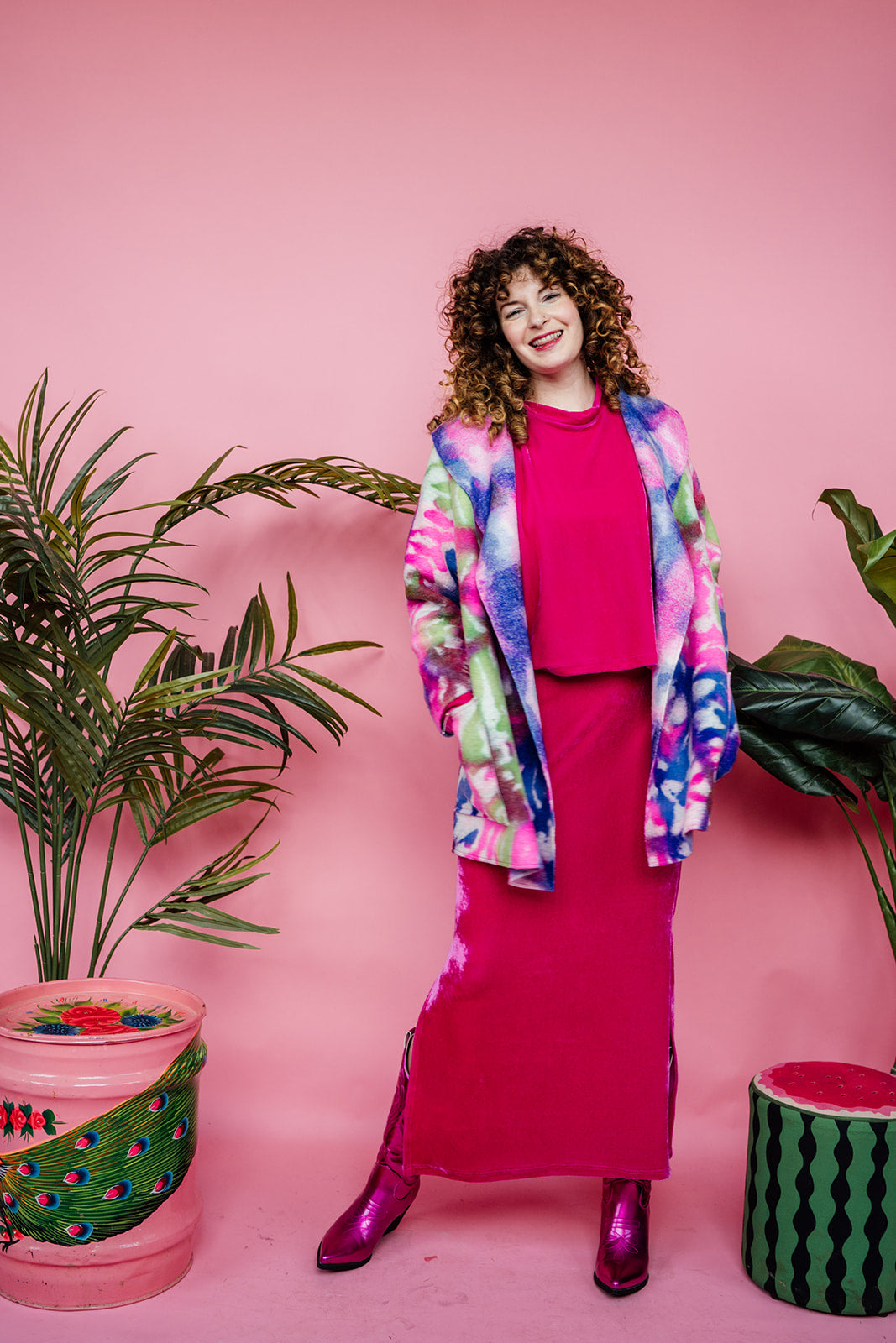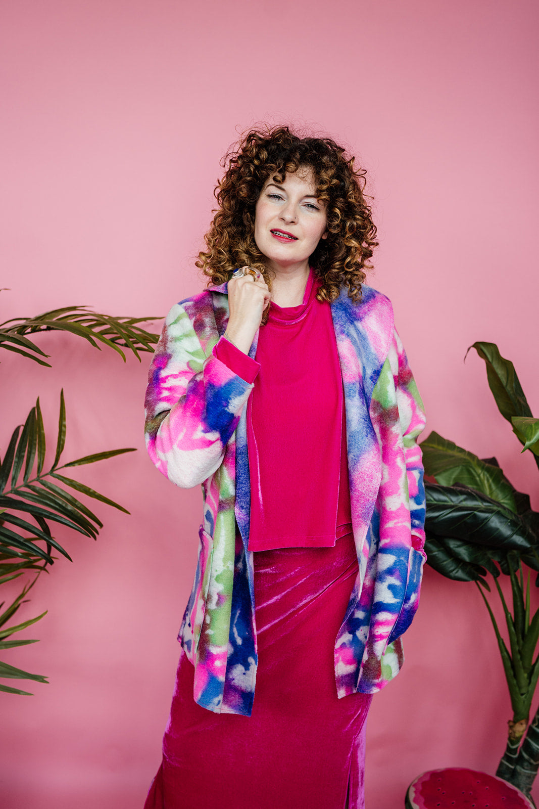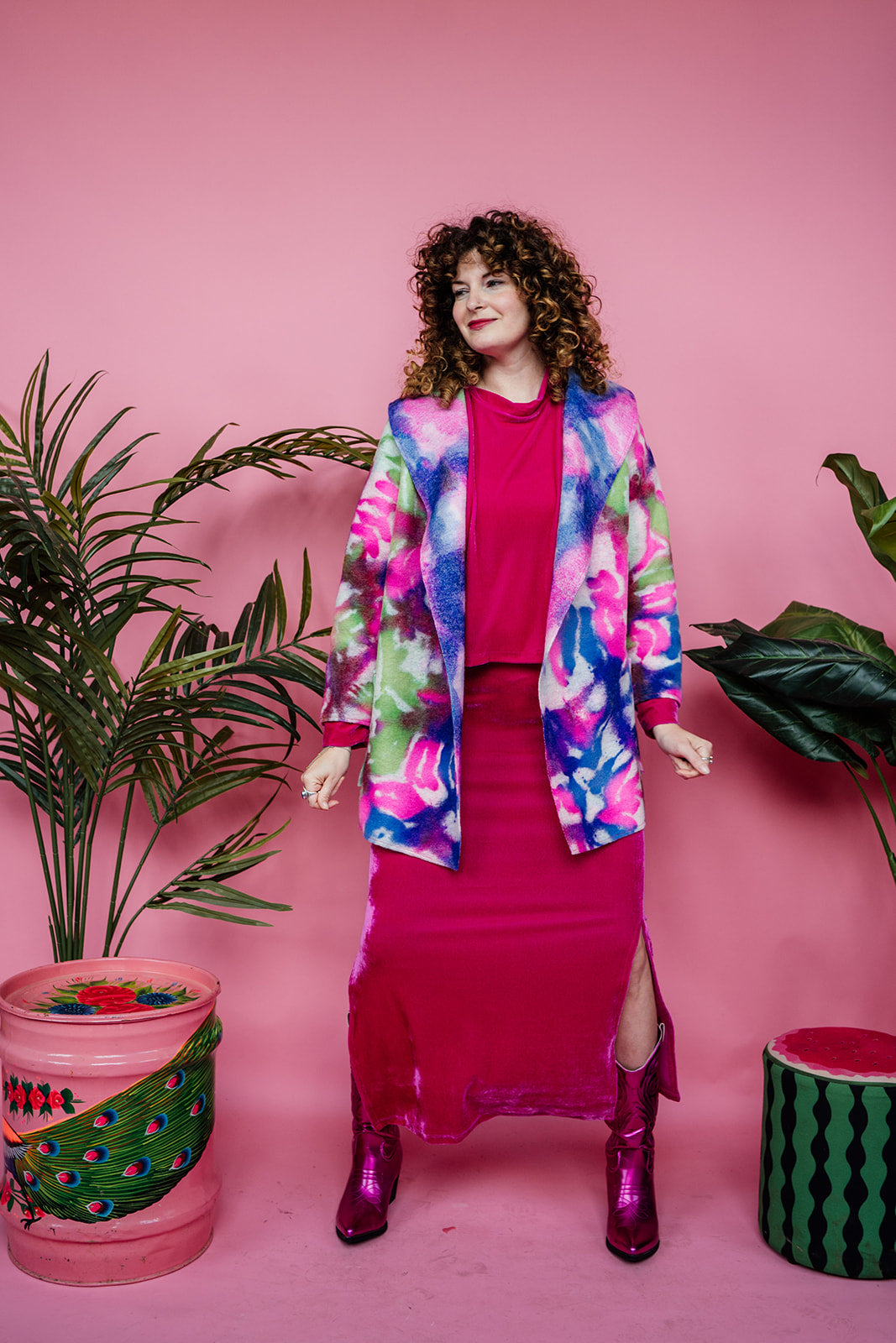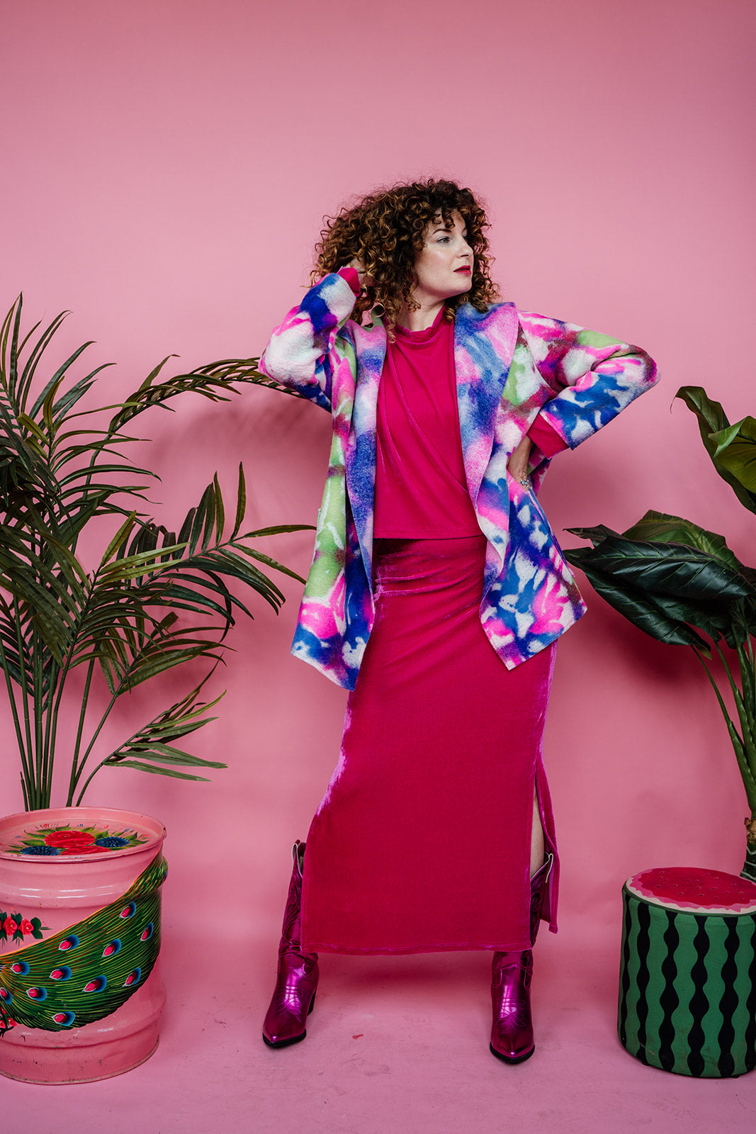 Styled with Velvet Batwing in Bright Pink and Velvet Split Skirt in Bright Pink