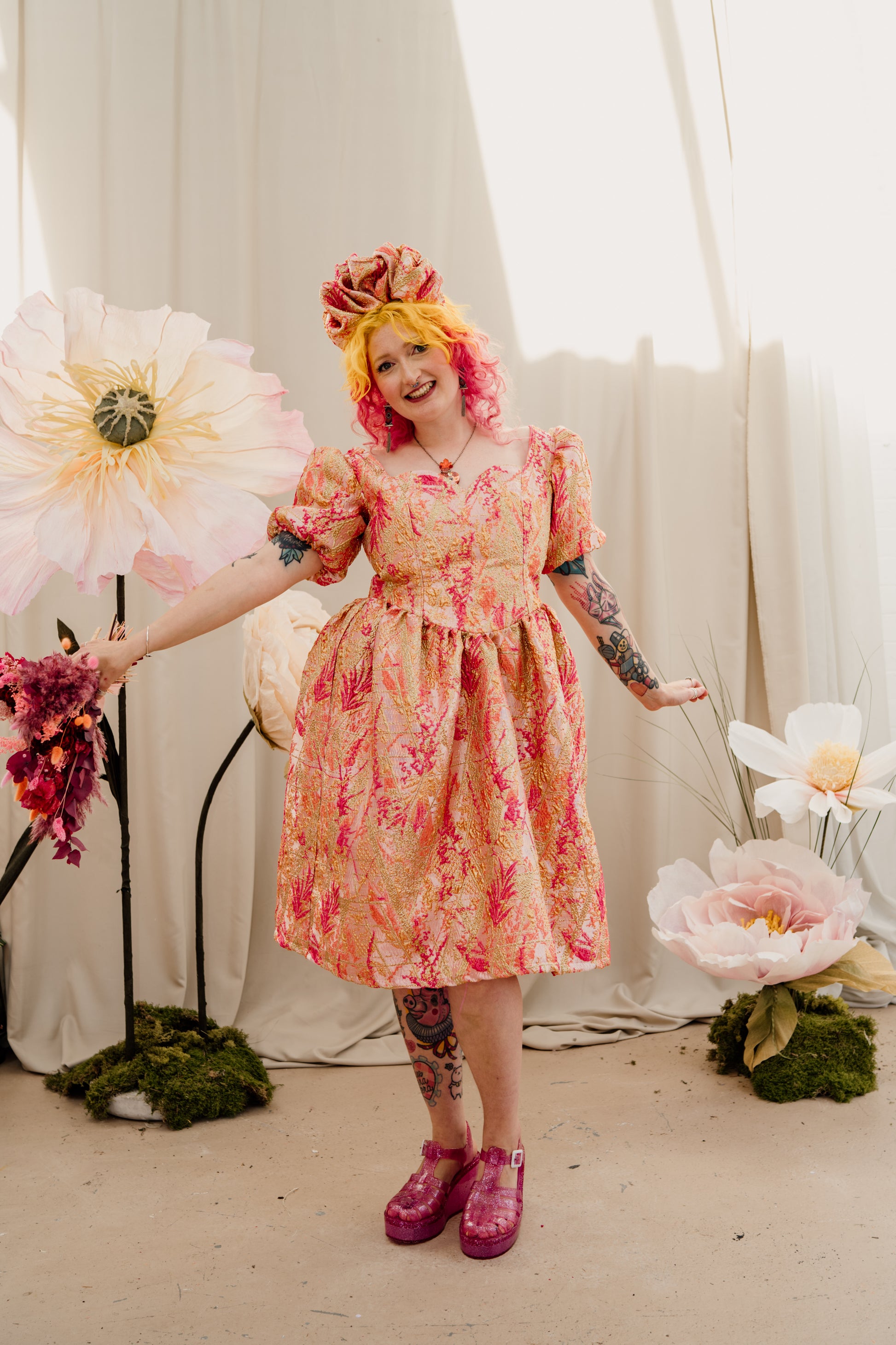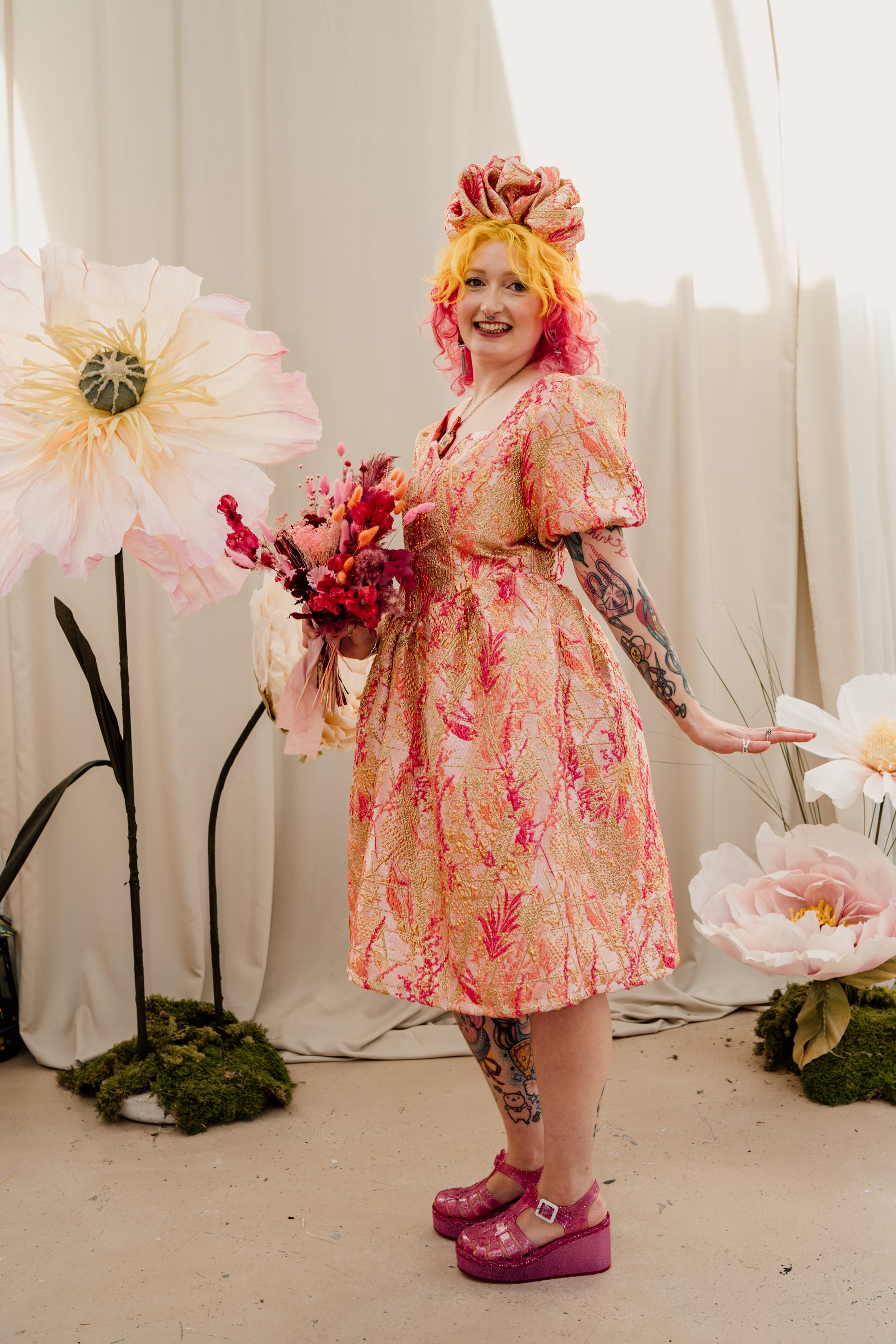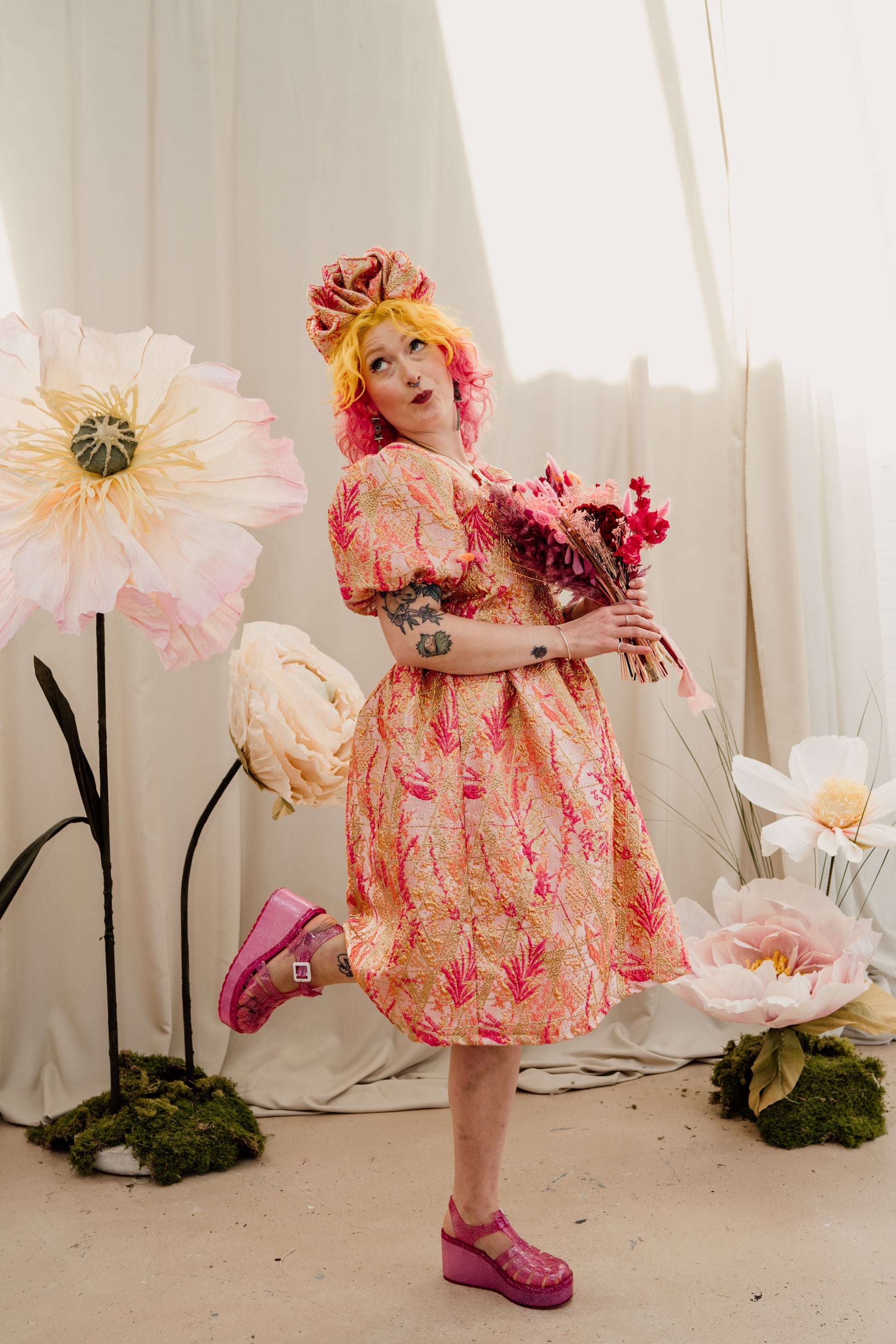Puff Sleeve Dress in Gold & Coral