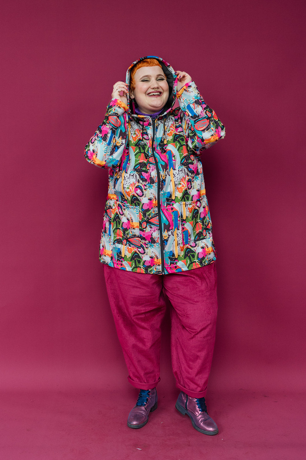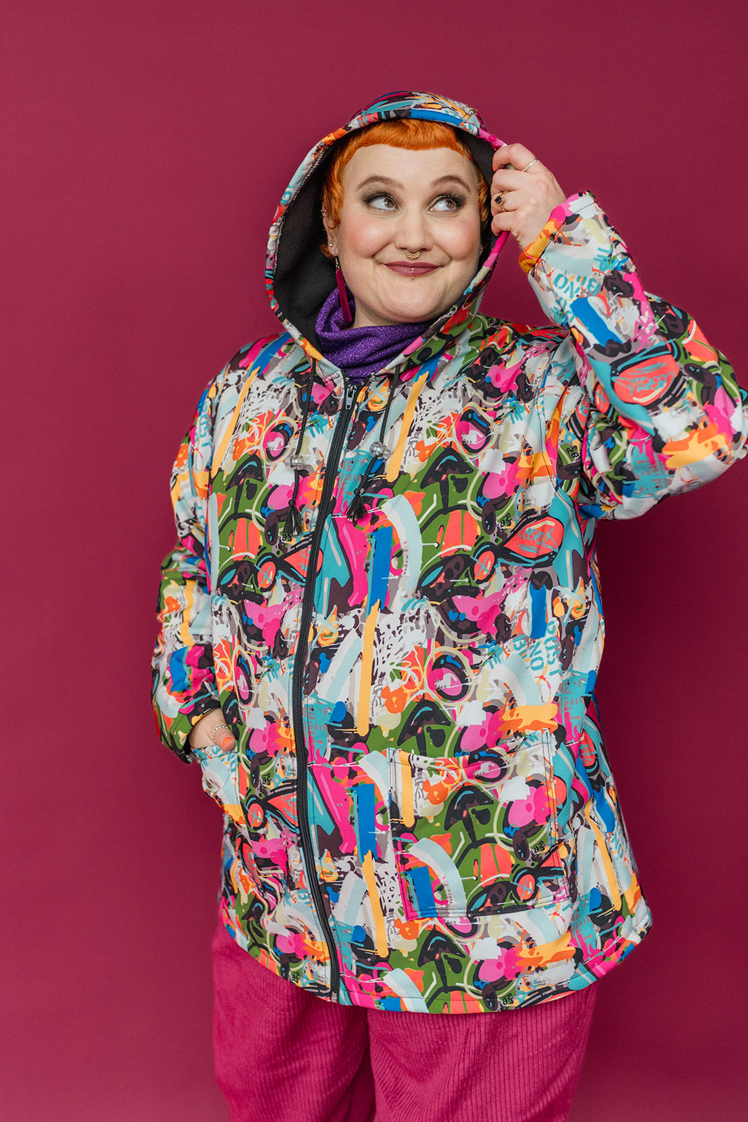 Graffiti print raincoat with fleece lining and shower-proof fabric. Also featuring a hood and front patch pockets for convenience and cosiness.