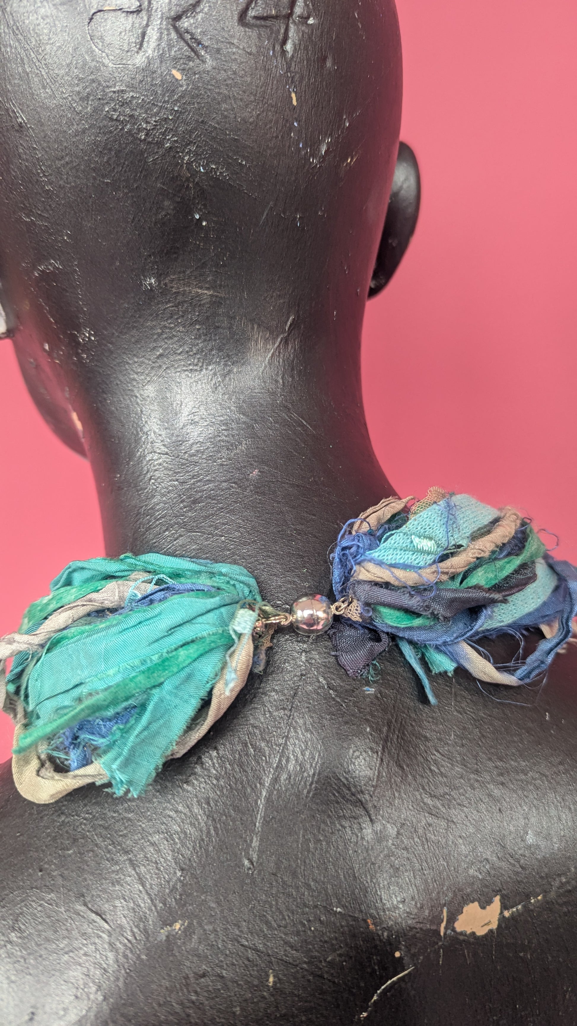 Multi strand, silk yarn necklace with magnetic clap. Features over twenty strands of various novelty yarns. Torn sari silks and hand painted polyamide are often used. Over 30 colourways available and updated regularly.
