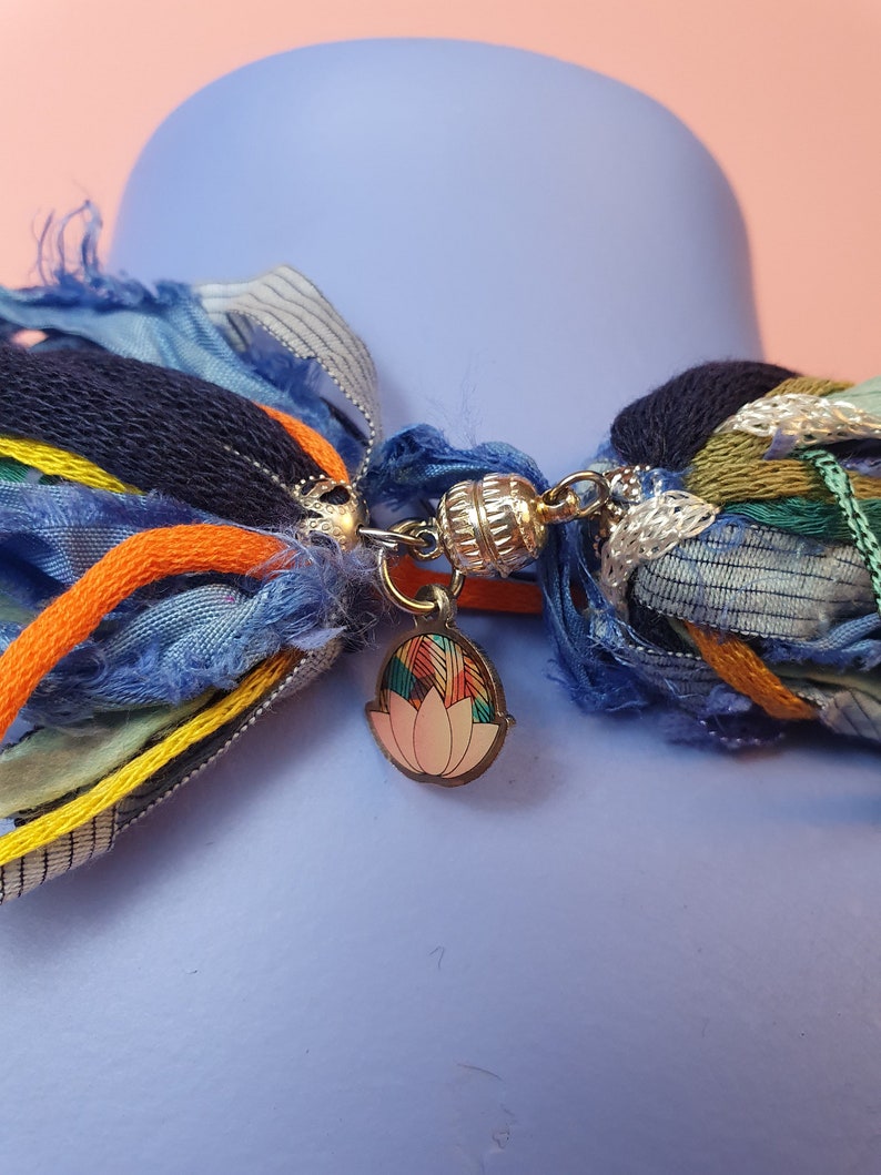 Multi strand, silk yarn necklace with magnetic clap. Features over twenty strands of various novelty yarns. Torn sari silks and hand painted polyamide are often used. Over 30 colourways available and updated regularly. Each necklace is unique and may not include every material pictured but will follow the same colour theme. Please contact us directly for custom or alternative colour options.