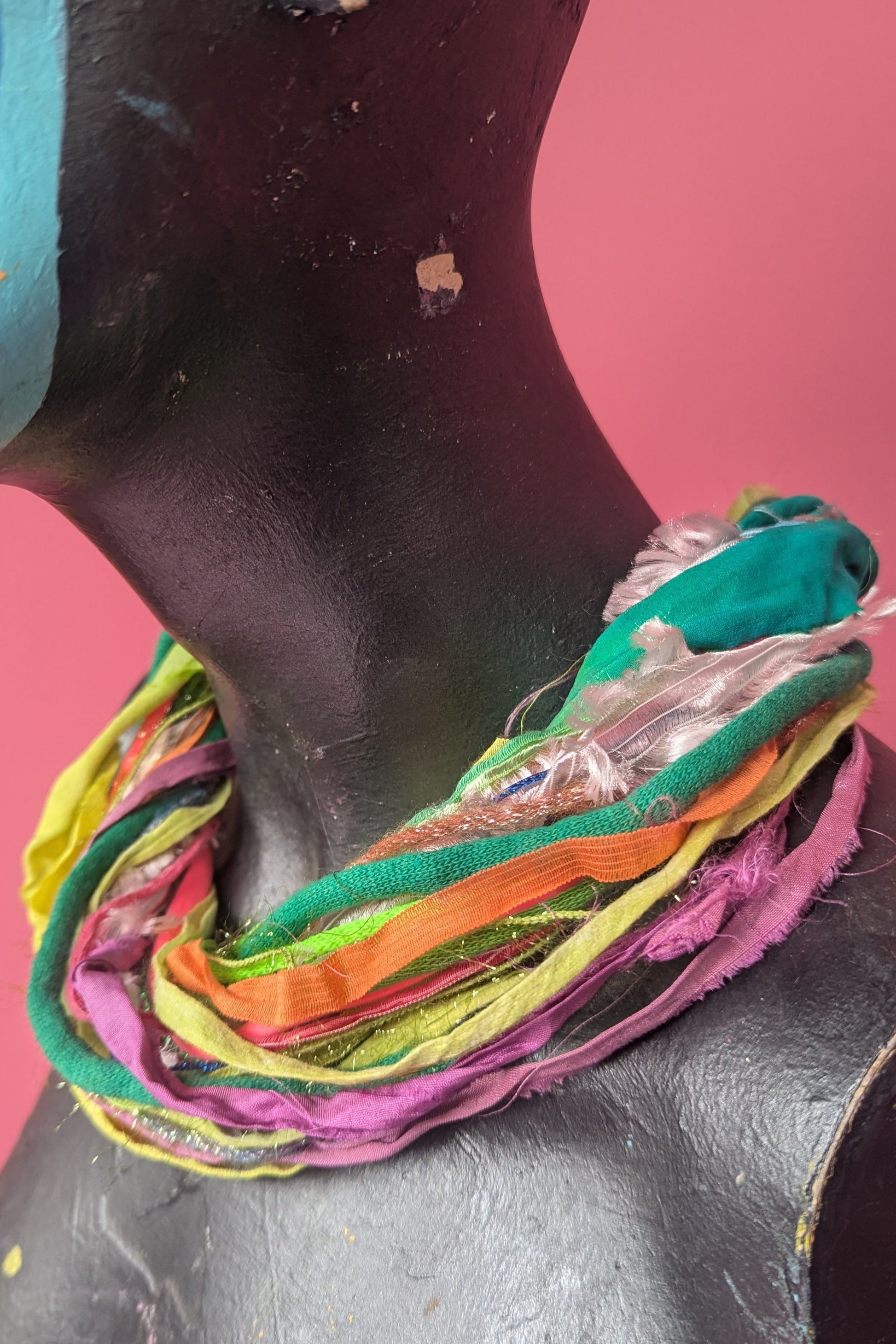 Multi strand, silk yarn necklace with magnetic clap. Features over twenty strands of various novelty yarns. Torn sari silks and hand painted polyamide are often used. Over 30 colourways available and updated regularly.