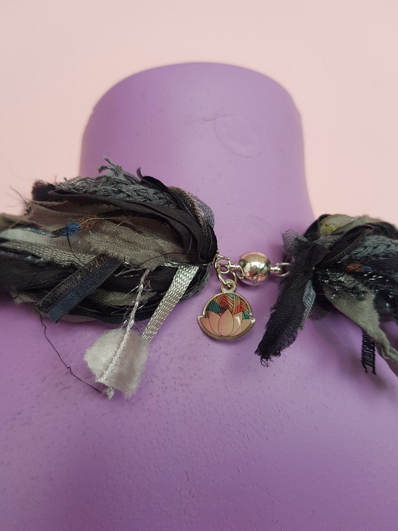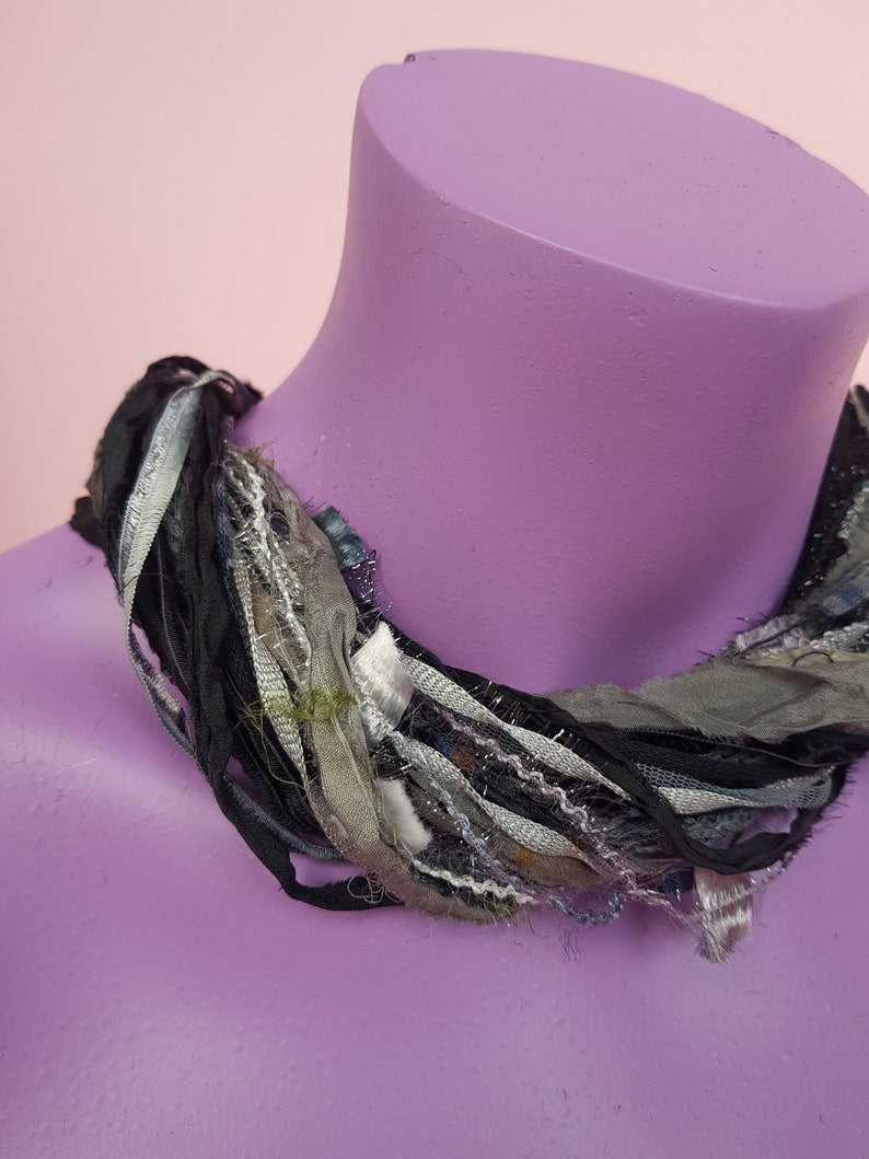 Multi strand, silk yarn necklace with magnetic clap. Features over twenty strands of various novelty yarns. Torn sari silks and hand painted polyamide are often used. Over 30 colourways available and updated regularly. Each necklace is unique and may not include every material pictured but will follow the same colour theme. Please contact us directly for custom or alternative colour options.