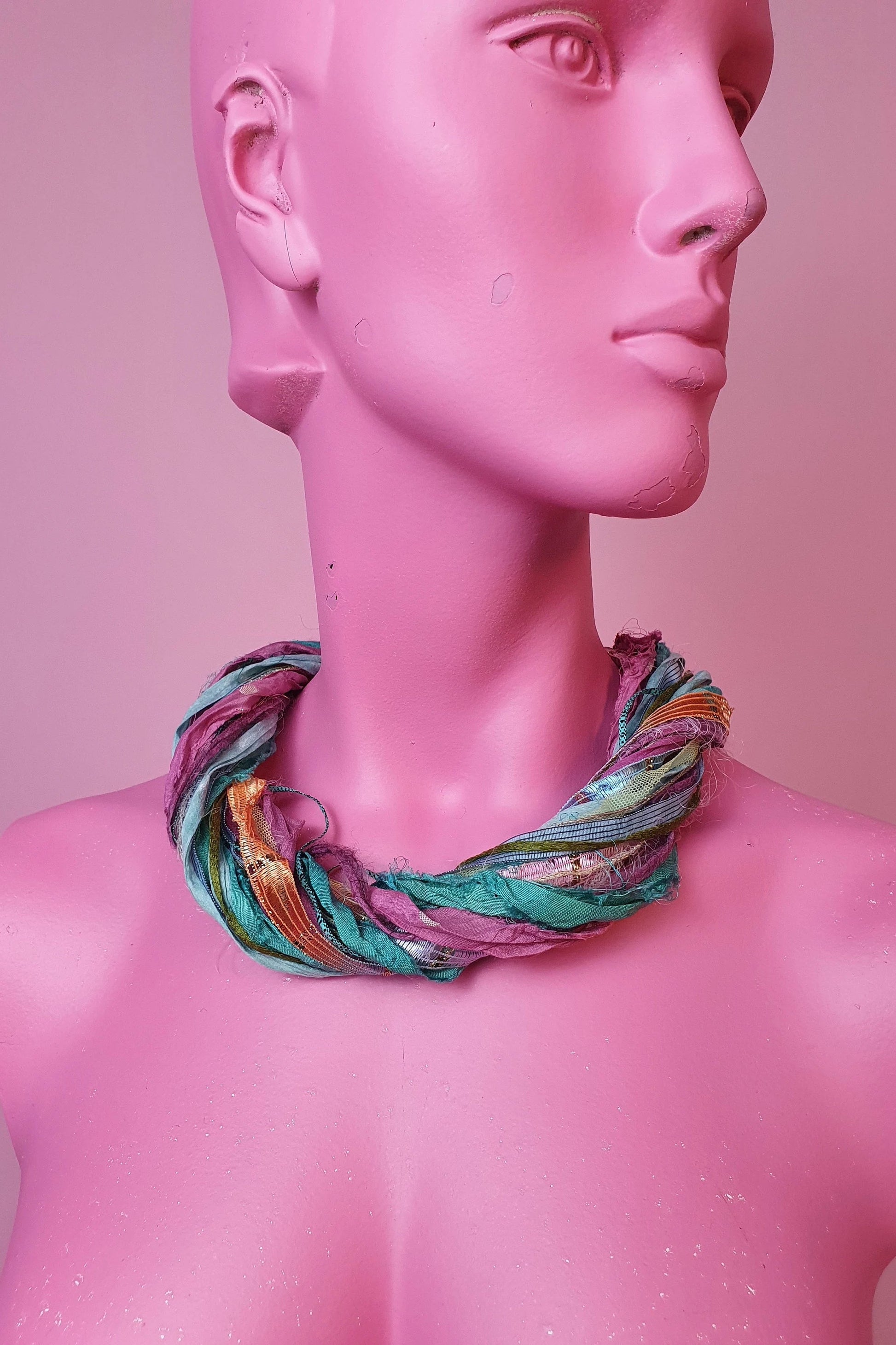 Multi strand, silk yarn necklace with magnetic clap. Features over twenty strands of various novelty yarns. Torn sari silks and hand painted polyamide are often used. Over 30 colourways available and updated regularly. Each necklace is unique and may not include every material pictured but will follow the same colour theme. Please contact us directly for custom or alternative colour options.