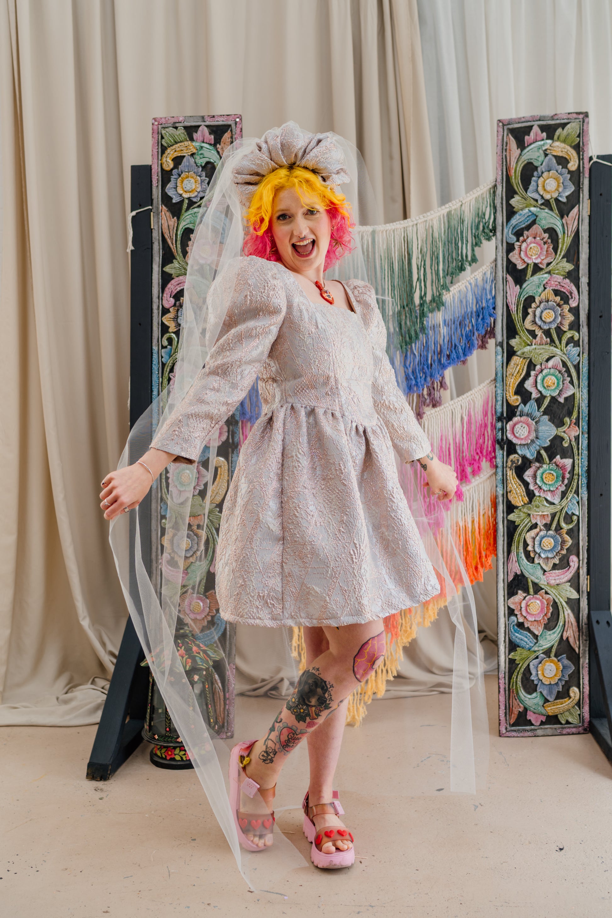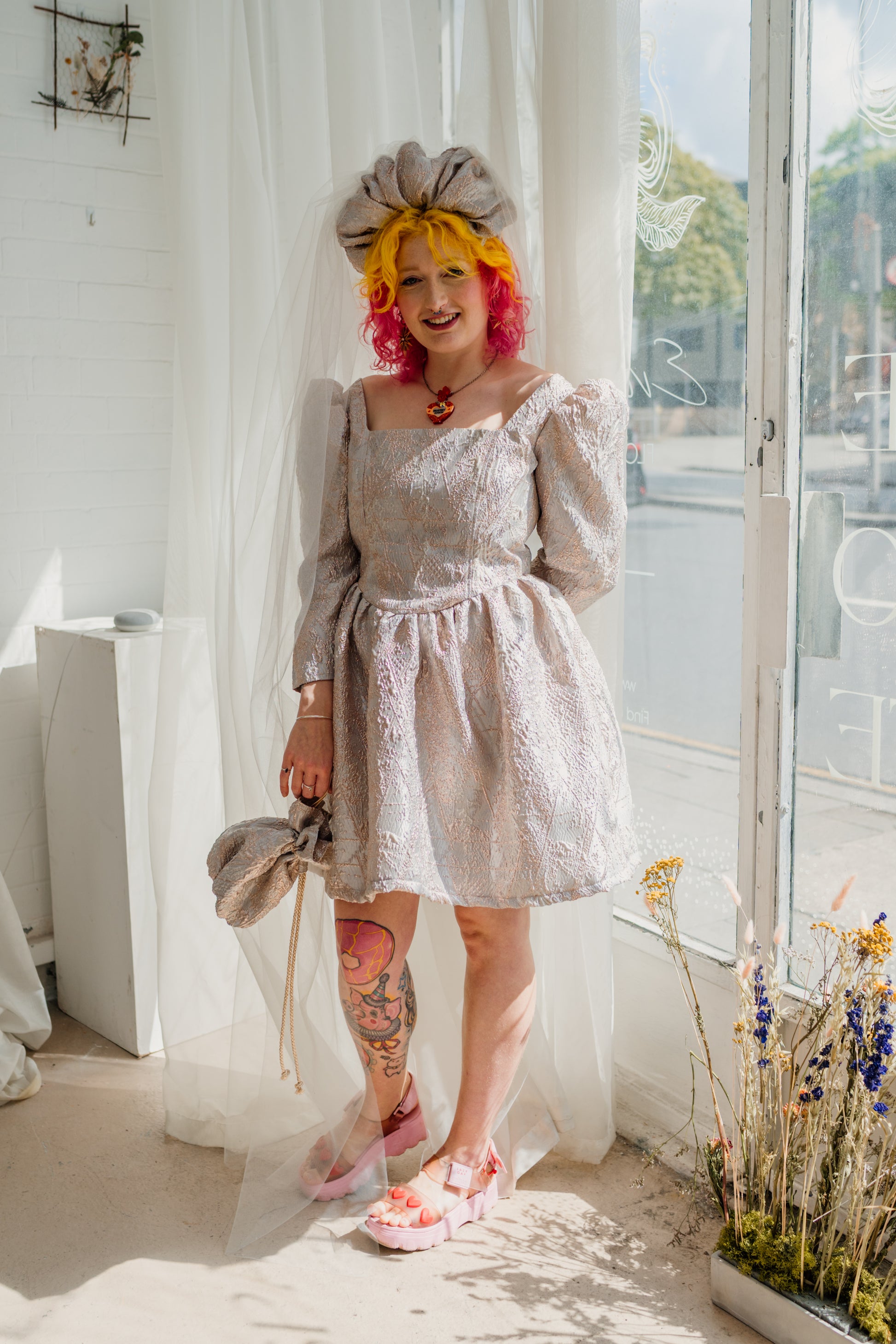 Amazing lined dress in our super luxe metallic fabric. This dress has metallic thread all the way through it making it extra shimmery and perfect for your big day!