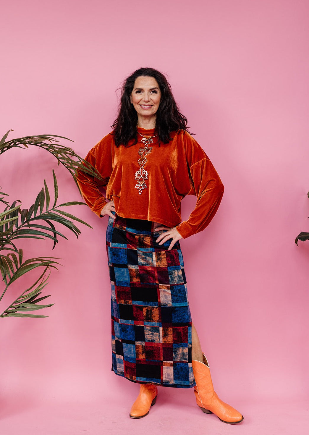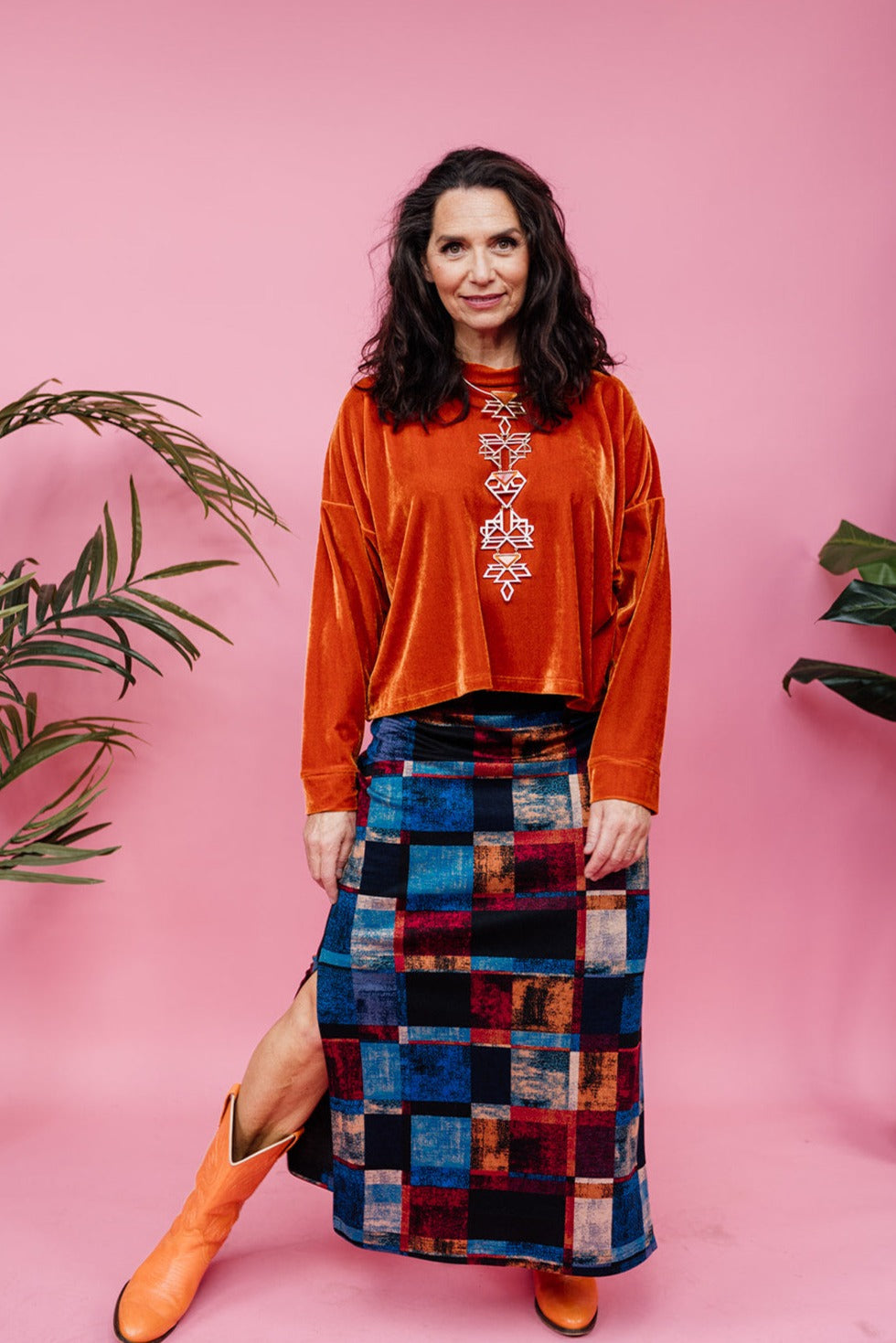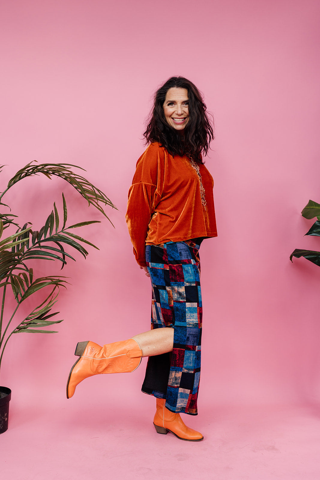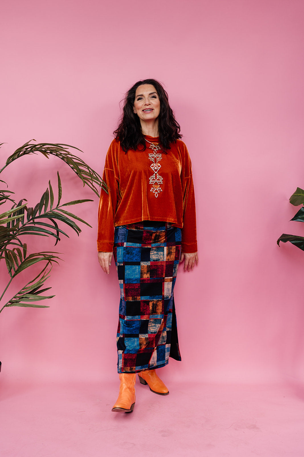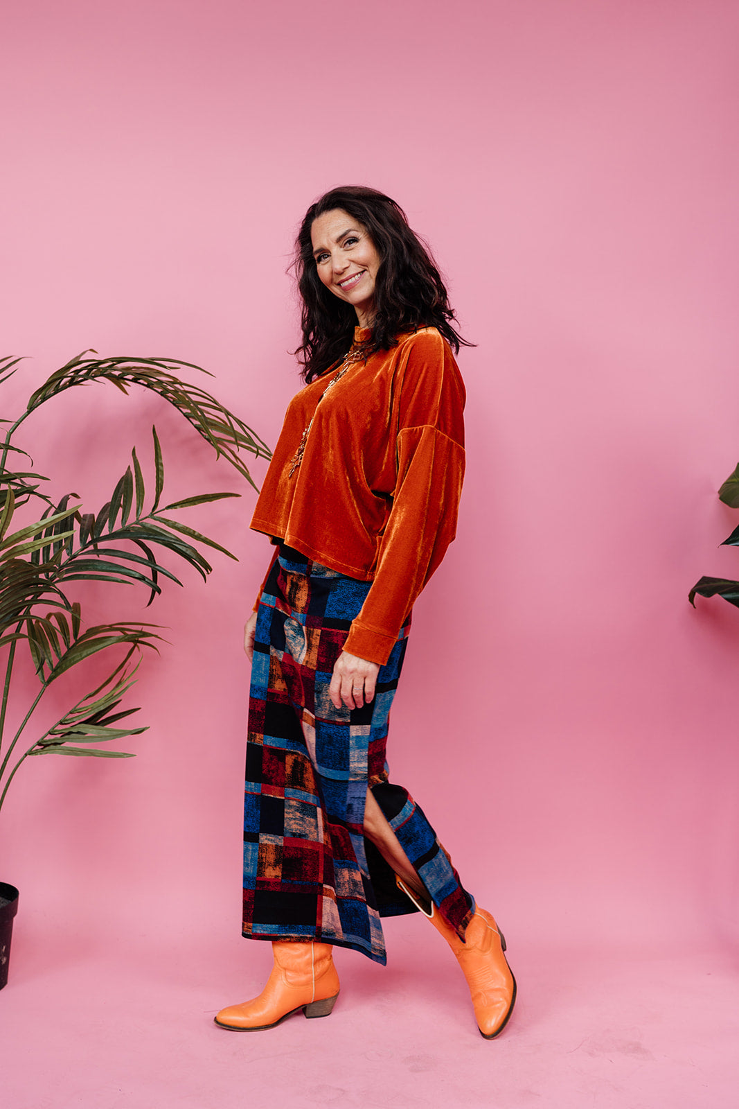 Glamorous yet comfy, this is our slouchy fit top with funnel neck and drop shoulders. Handmade in luxurious velvet.