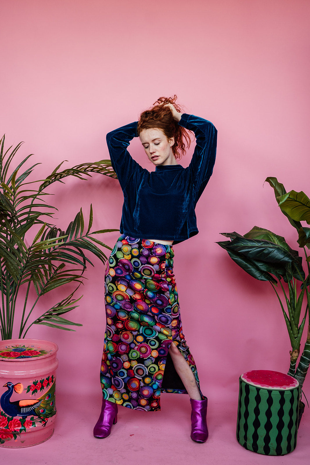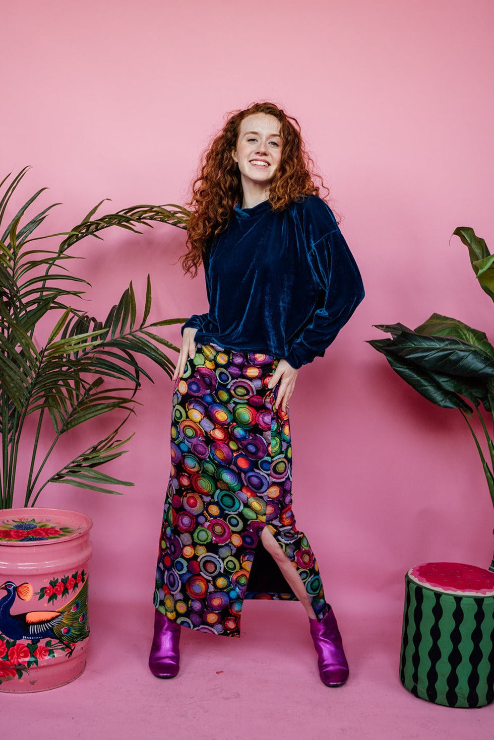Glamorous yet comfy, this is our slouchy fit top with funnel neck and drop shoulders. Handmade in luxurious velvet.