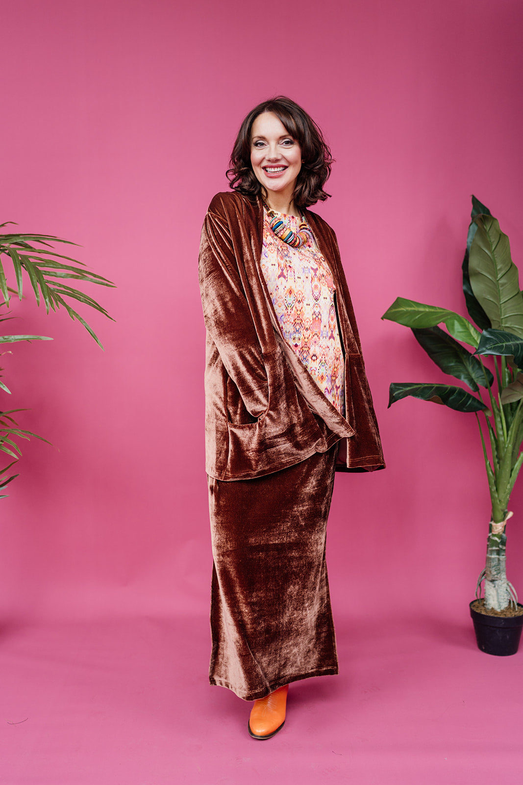 Styled with 3/4 Top in Peach Aztec and Velvet Split Skirt in Chocolate