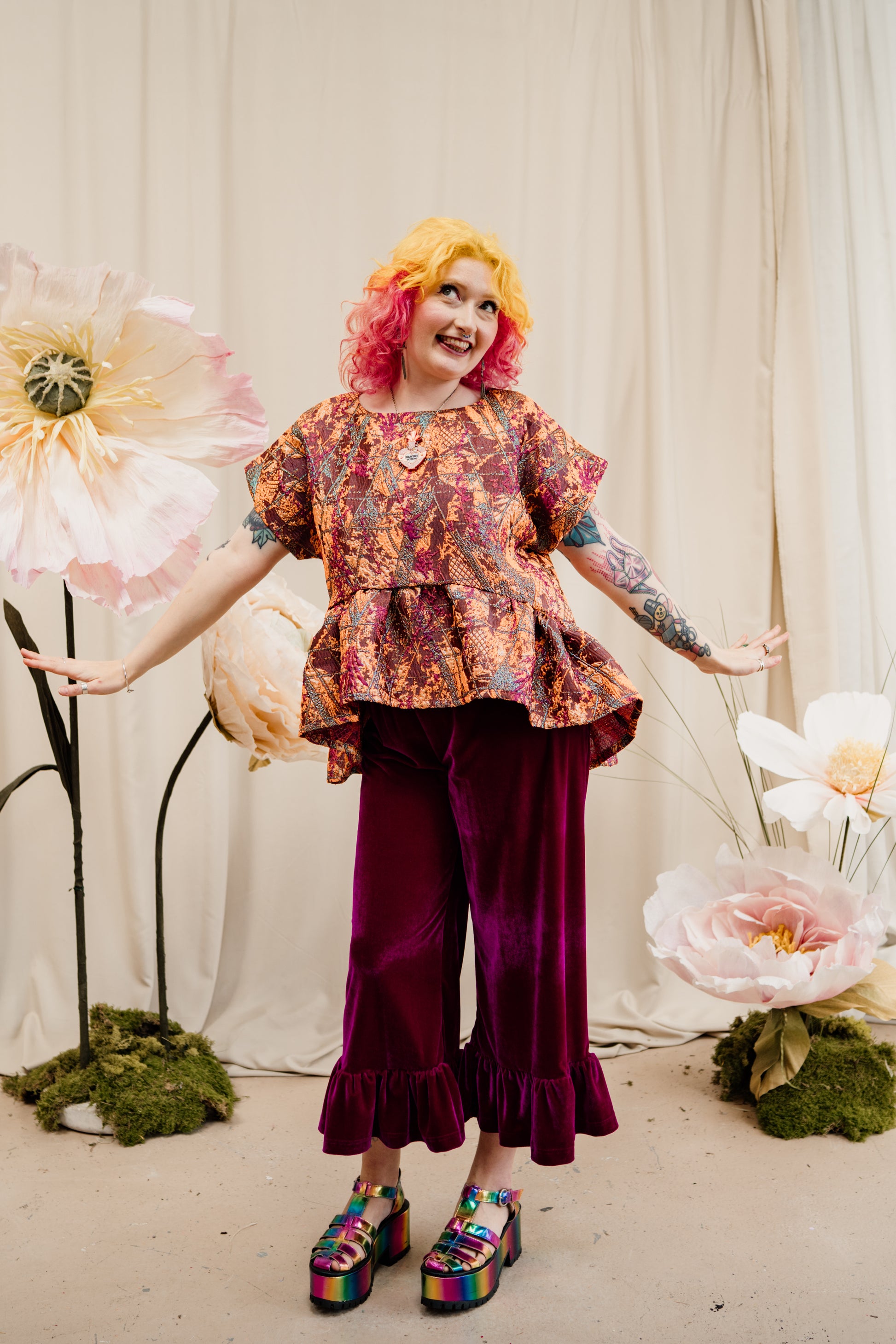 Handmade loose-fitting trousers in super soft velvet. The ruffle hem adds an extra swish to your step!