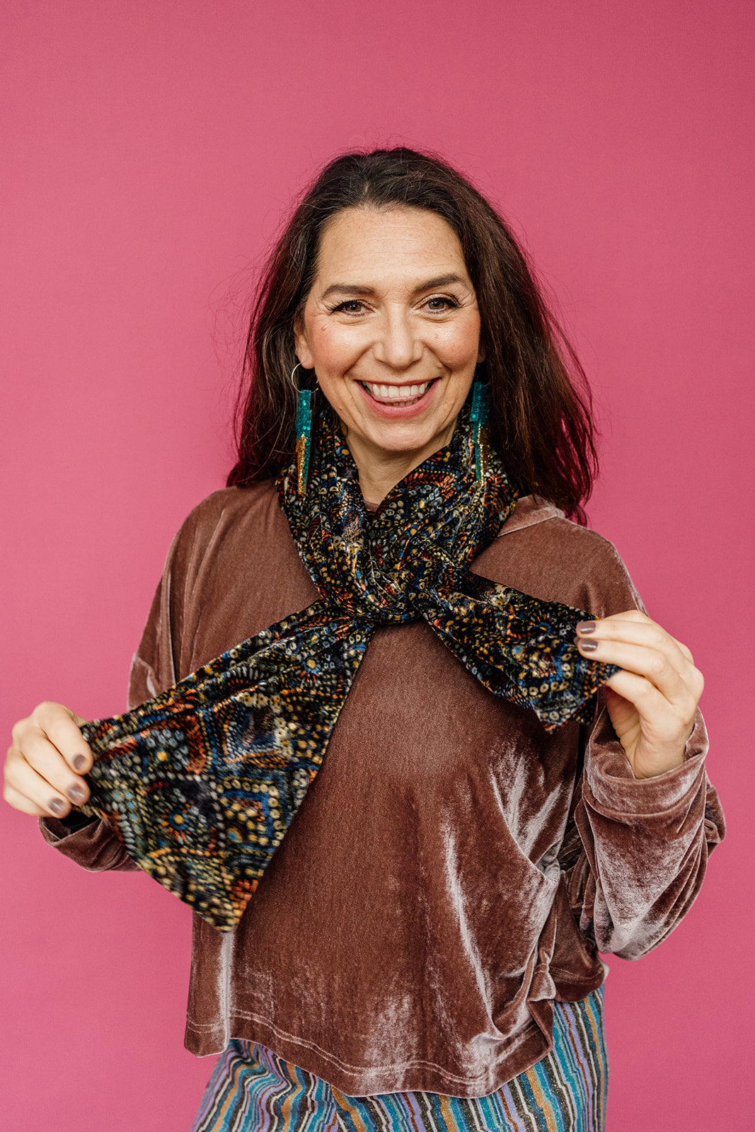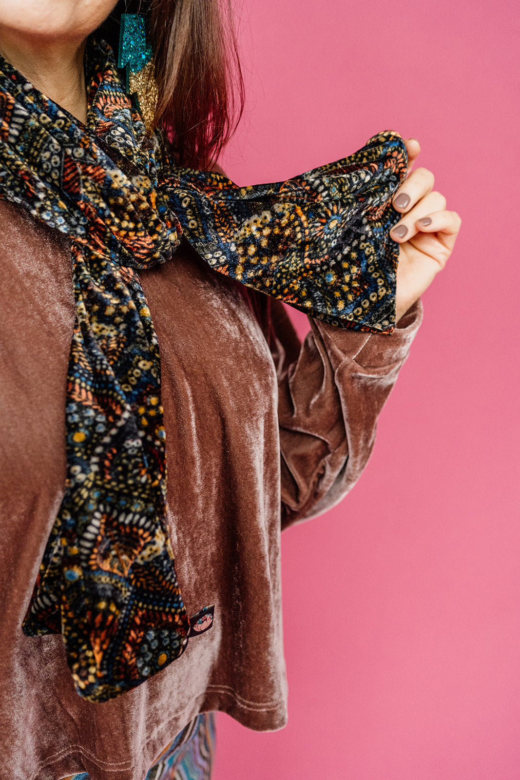 Luxurious velvet scarf in our this gorgeous baroque style multi dot print. This is such a stunning topper to any outfit, made in the softest velvet. This scarf feels beautifully luxurious and would make an absolutely stunning gift.