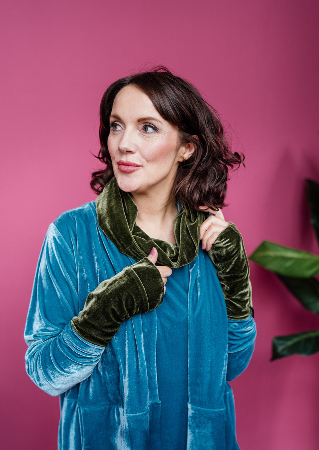 Velvet wrist warmers in dark Olive. To be worn as a fashionable extension to the sleeve, these wrist warmers are very comfortable to wear and are perfect for those with poor circulation.