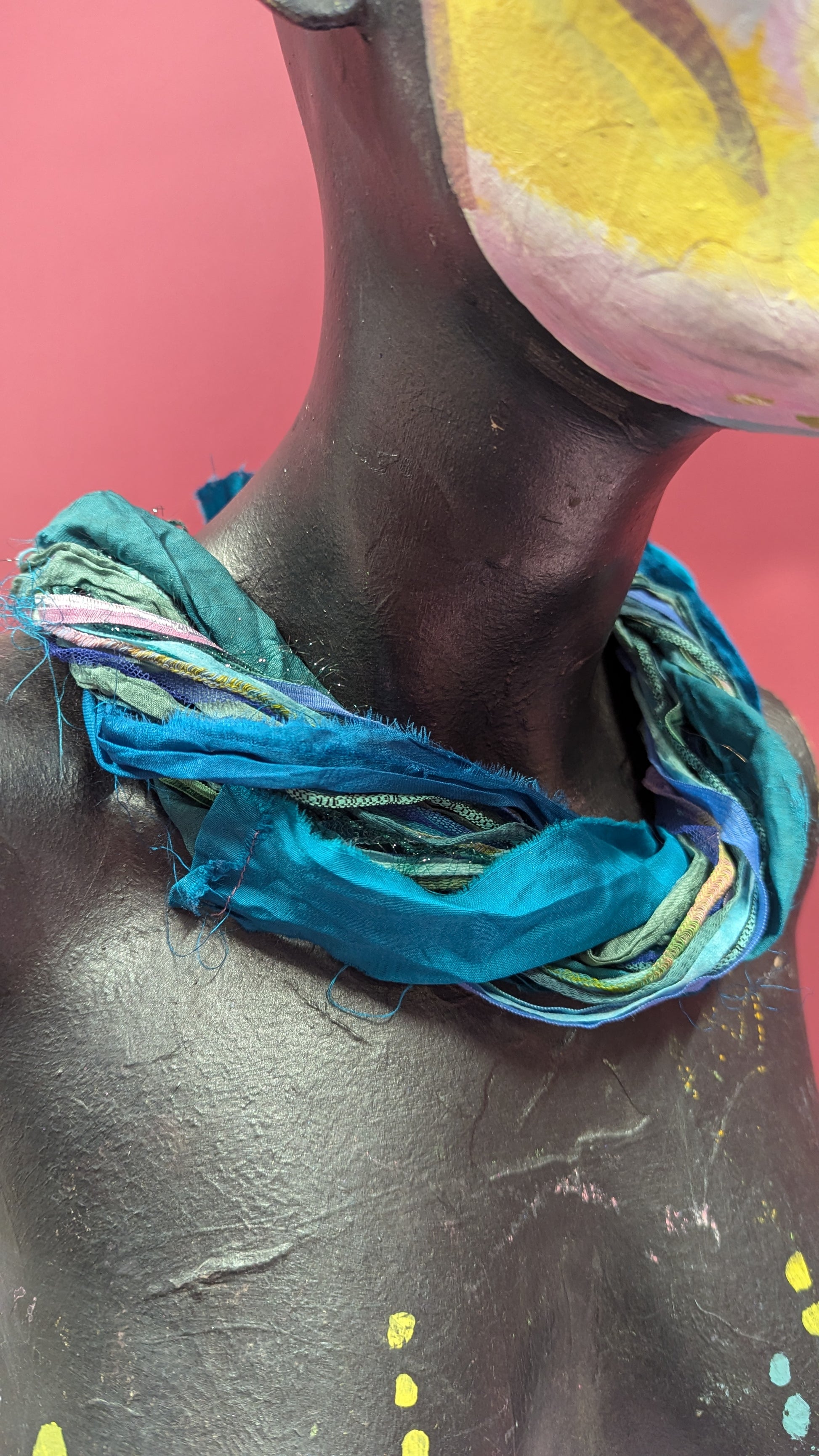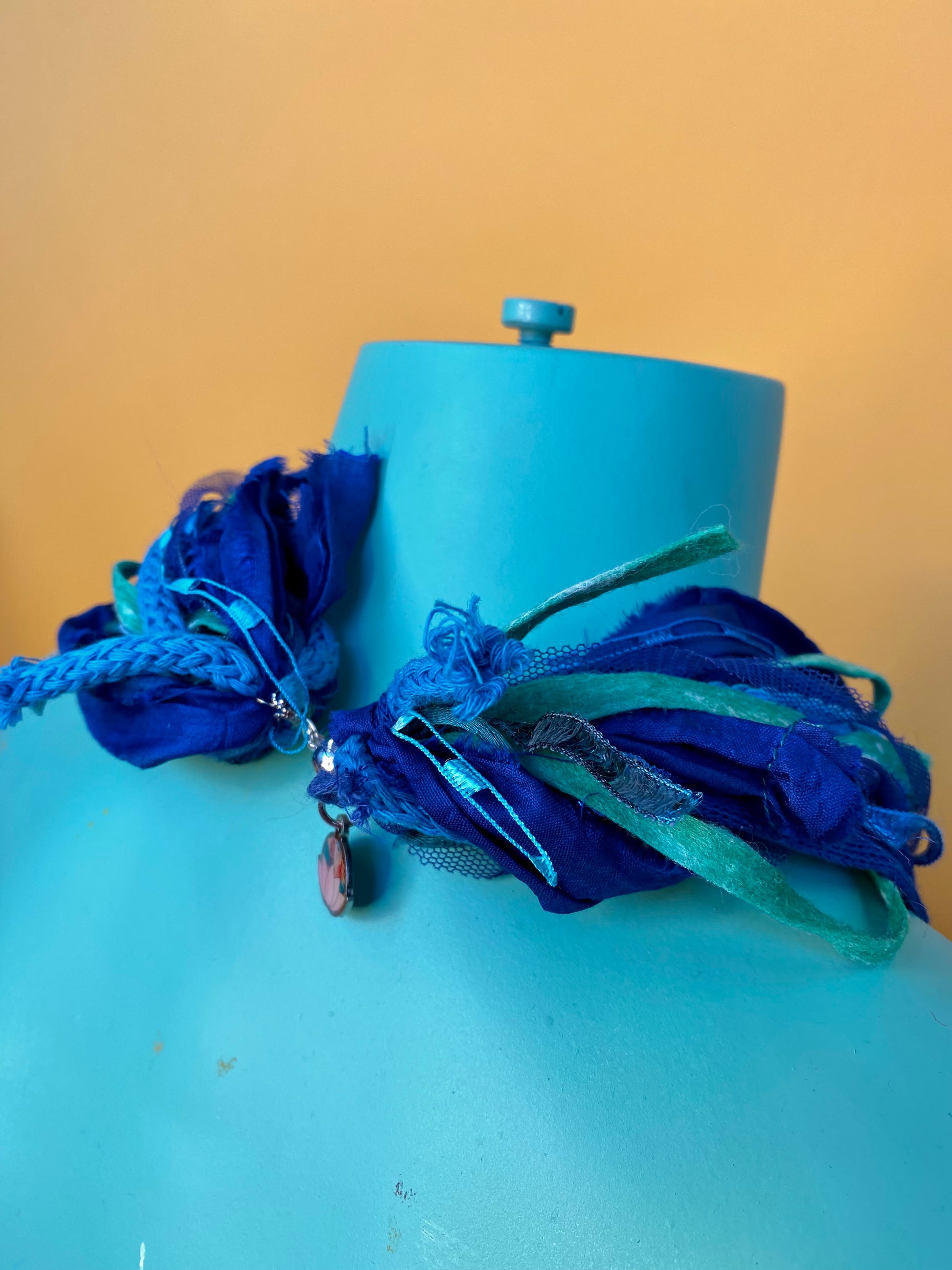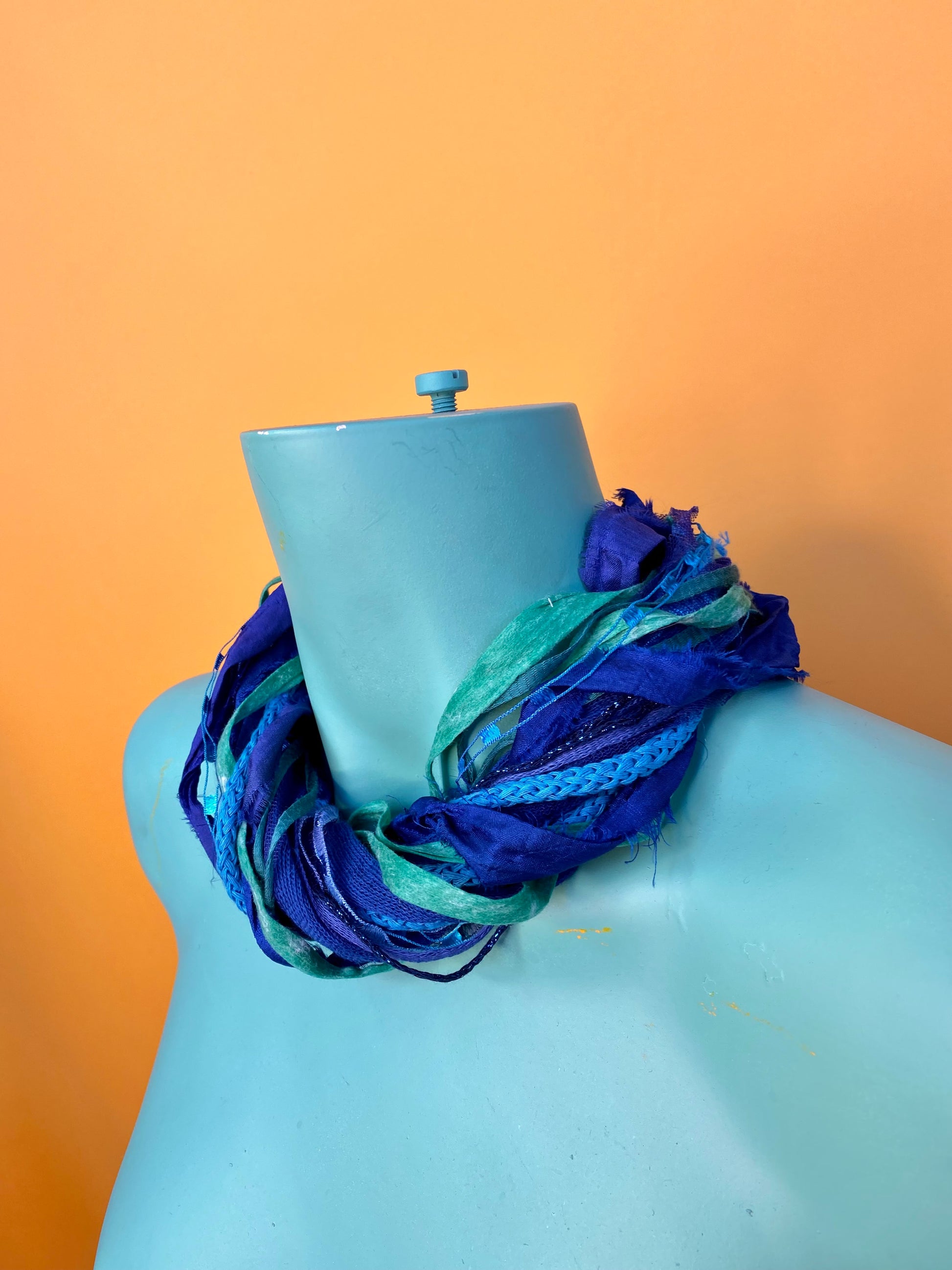 Multi strand, silk yarn necklace with magnetic clap. Features over twenty strands of various novelty yarns. Torn sari silks and hand painted polyamide are often used. Over 30 colourways available and updated regularly.